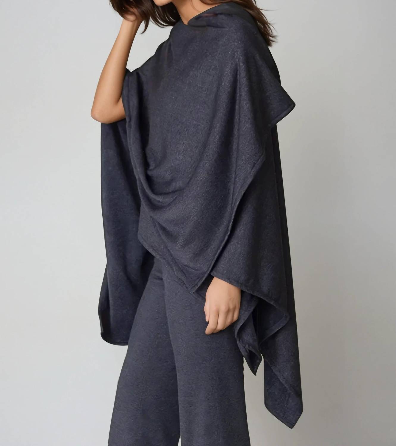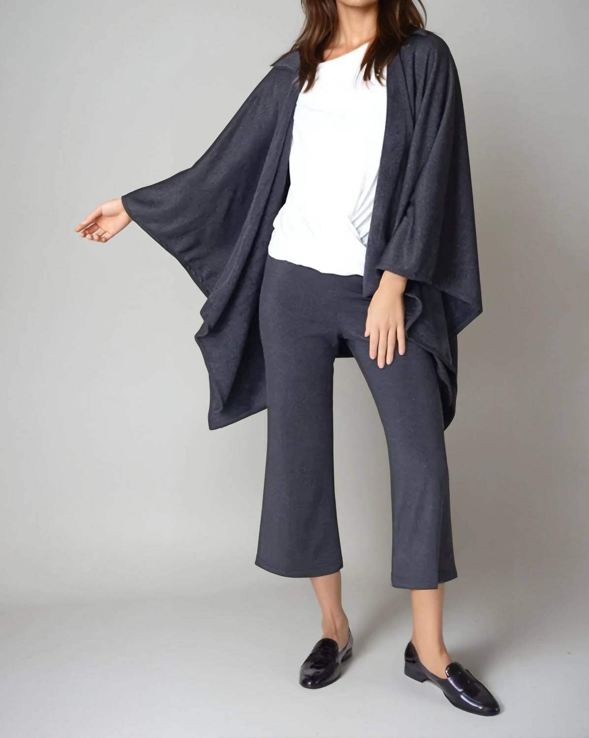 The coolest cape you ever did see. Wrap yourself in the ultimate comfort with the Buki Cape Wrap Kimono in Charcoal Grey, designed for refined elegance. This long sleeve garment is crafted from a luxurious blend of 28% Micro Polyester, 51% Micro Acrylic, and 21% Modal, offering a cashmere-like softness and a solid, sleek silhouette. Featuring a collar neckline and a pull-on closure, it's ideal for travel or any chic occasion, effortlessly embracing the quiet luxury trend. Care: Machine washable, eliminating the need for dry cleaning, ensuring easy maintenance.
