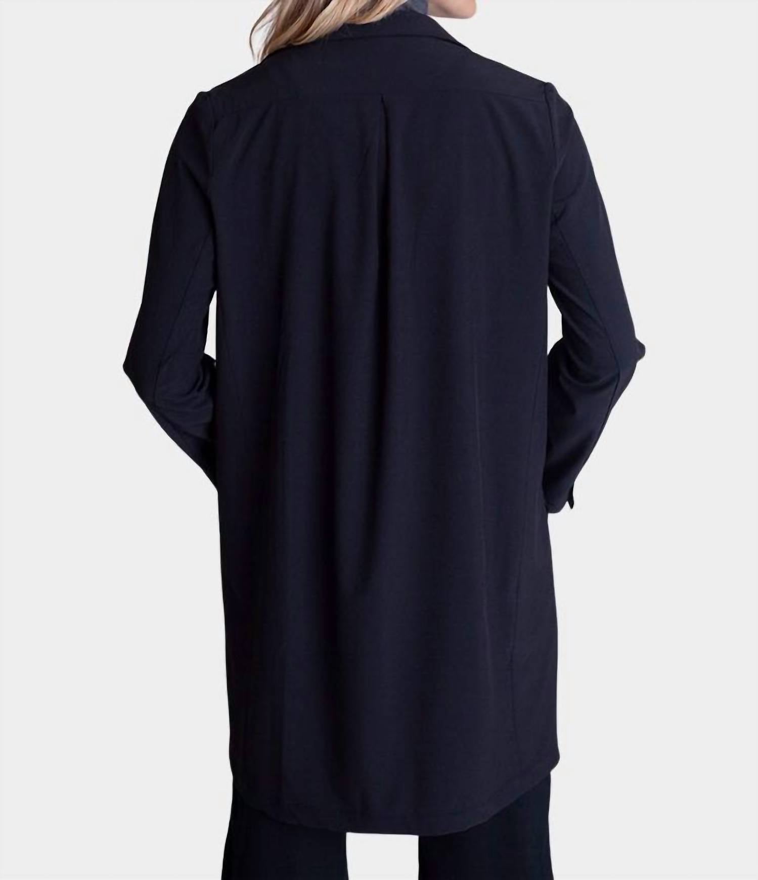 The coolest cape you ever did see. Discover the Buki Travel Duster Jacket, an essential layer for any ensemble crafted from Buki Tech Light fabric. This long sleeve jacket, composed of 92% polyester and 8% spandex, is a versatile travel companion featuring a flattering collar neckline and convenient button closure. Designed to keep you comfortable on the go, it boasts engineered moisture management, wrinkle resistance, and exceptional four-way stretch, all showcasing its solid black elegance. Practical details include side and interior pockets, making it a packable, machine-washable piece perfect for fall adventures.