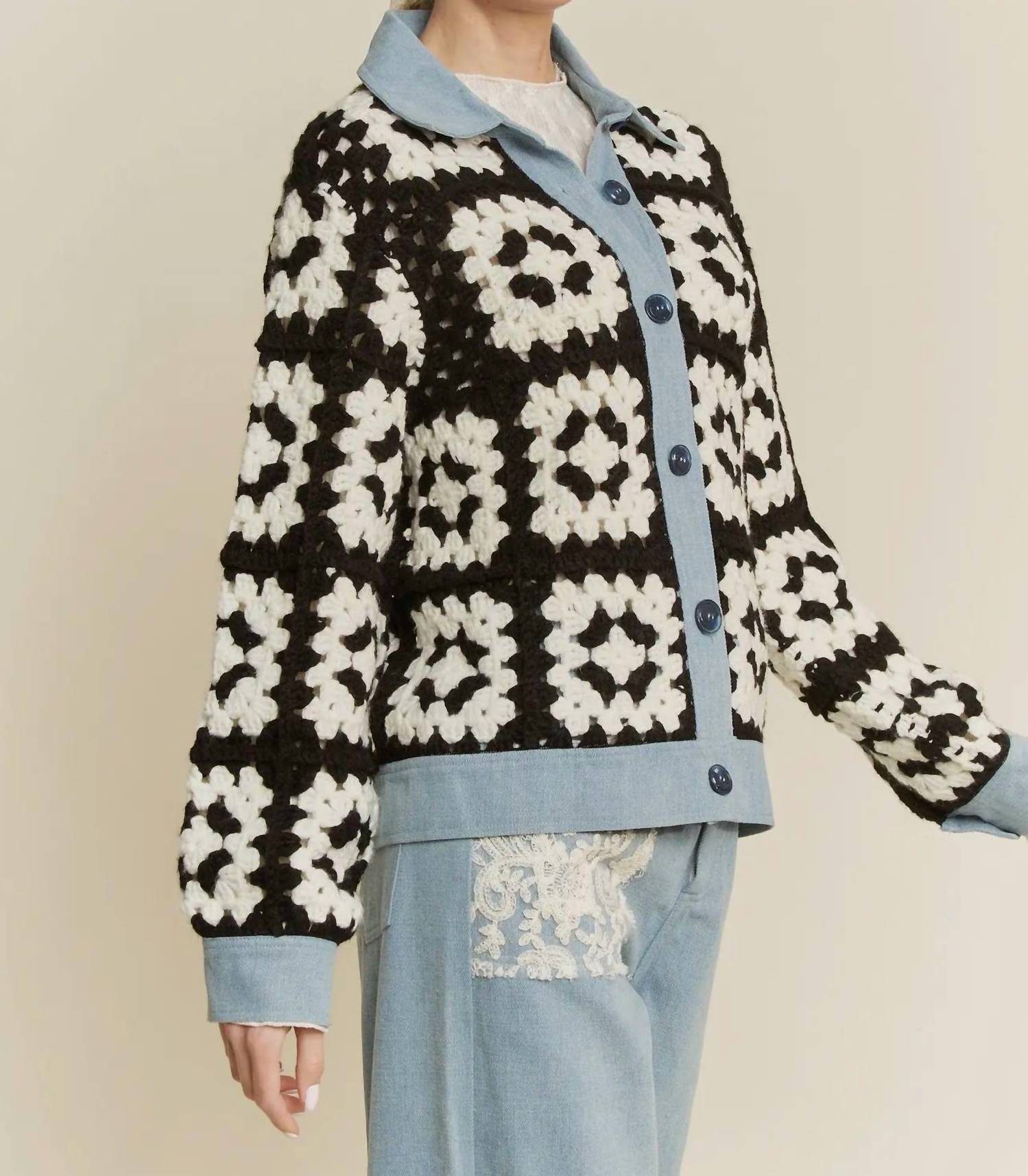Cute, casual, and comfortable. This jacket is a must have. Elevate your wardrobe with the Crochet Bodice & Denim Detail Button Front Shirt Jacket by DAVI & DANI, a chic blend of crochet and denim in Black Multi. This casual piece features long sleeves and a stylish collar, perfect for any spring occasion. Crafted from 100% Acrylic, it offers a unique patterned look with a convenient button closure. For care, dry clean only to preserve its intricate design.