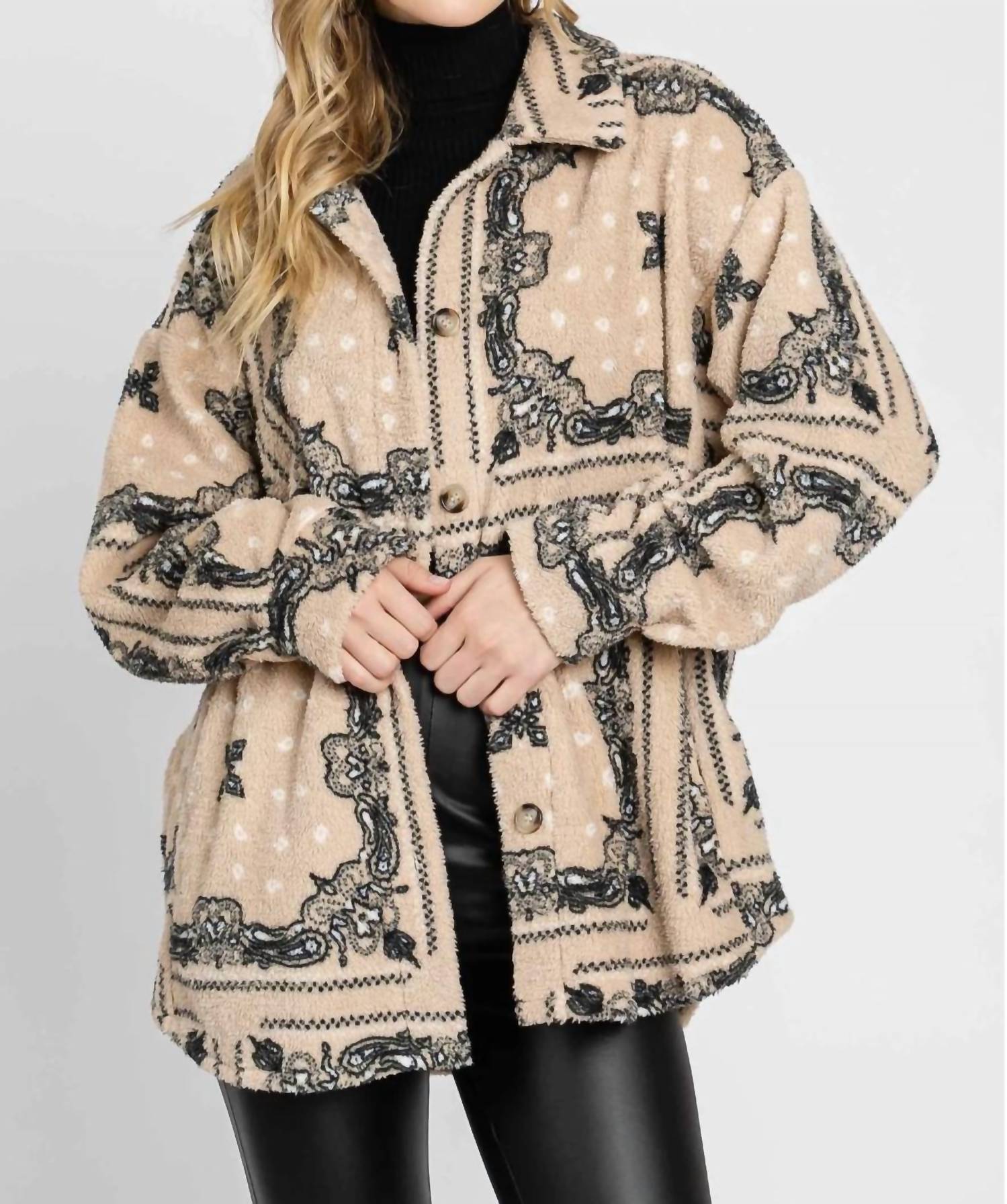 Elevate your outerwear collection with the Paisley Sherpa Button Down Jacket by Elleborn, a must-have in chic beige. This long sleeve teddy jacket features a sophisticated collar and patterned design, perfect for staying warm and stylish. Its button closure and faux front chest pockets add a practical touch to your look.