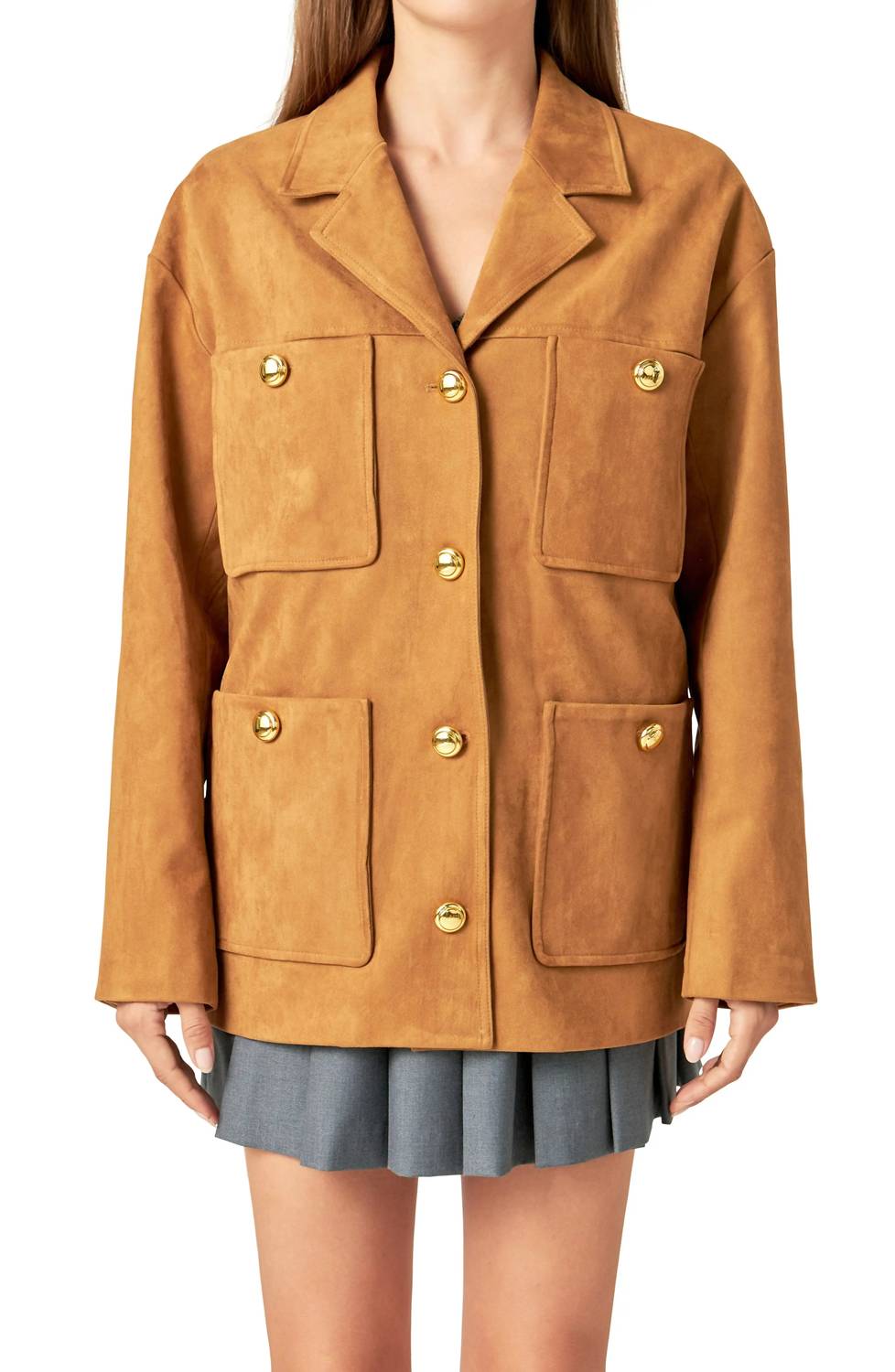 This utility jacket is the perfect combination of cool and feminine. Elevate your outerwear game with the Padded Shoulder Suede Jacket by English Factory in a striking Copper hue. This utility jacket boasts long sleeves and a supple faux-suede finish enhanced by glossy goldtone buttons. Crafted from 90% polyester and 10% spandex, it features a button closure and offers both chest and front button-patch pockets. Care instructions include hand washing and laying flat to dry, while classic details such as notched lapels and four-button cuffs complete this imported piece.