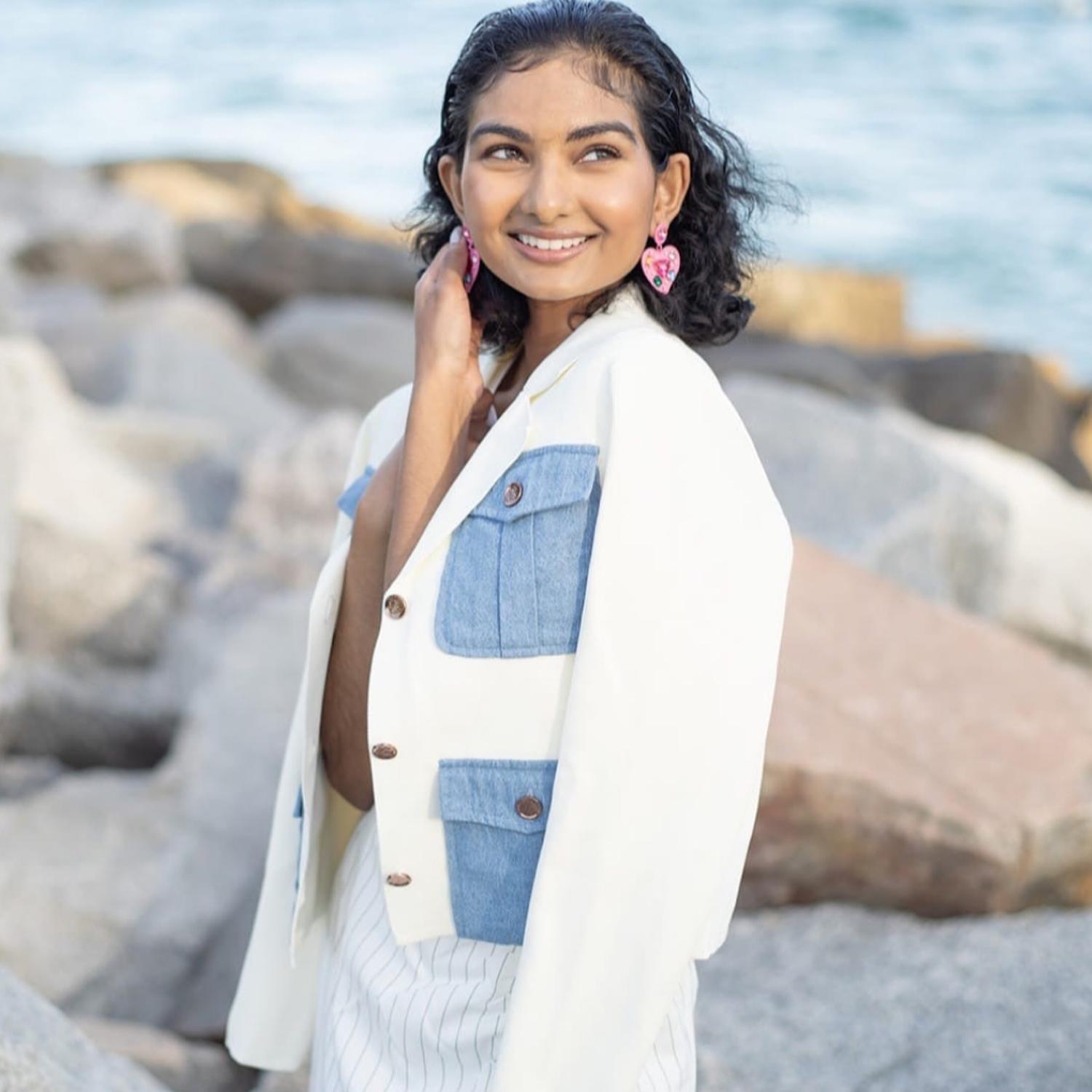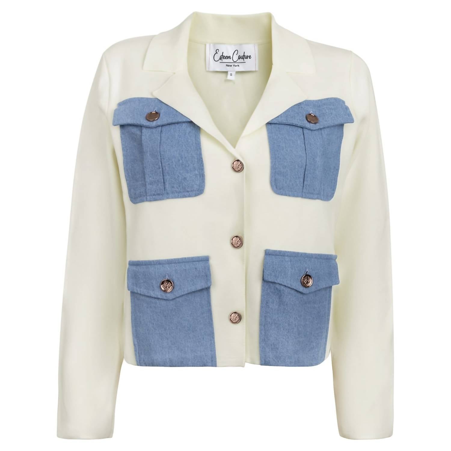 This utility jacket is the perfect combination of cool and feminine. Introducing the Harlow Jacket by Esteem Couture, a stylish utility jacket for women that blends fashion with function. This ivory piece features long sleeves and a contrasting patterned knit material, accentuated by denim bucket pockets for a unique touch. Designed with a collar neckline and button closure, it’s perfect for both casual and refined settings. Embrace the preppy trend this spring with this versatile jacket, ideal for back-to-school or Easter festivities.