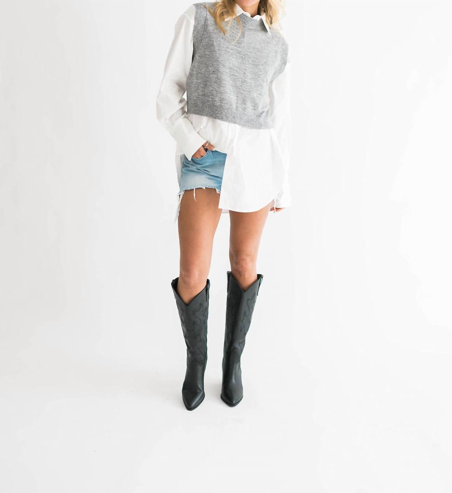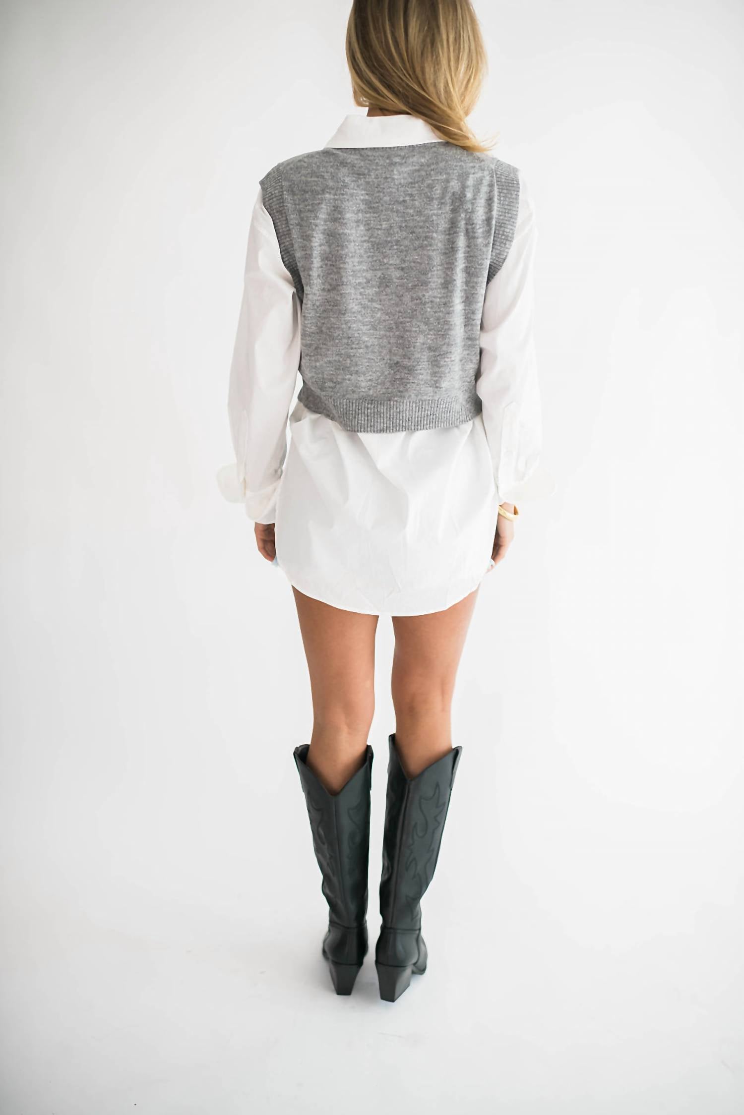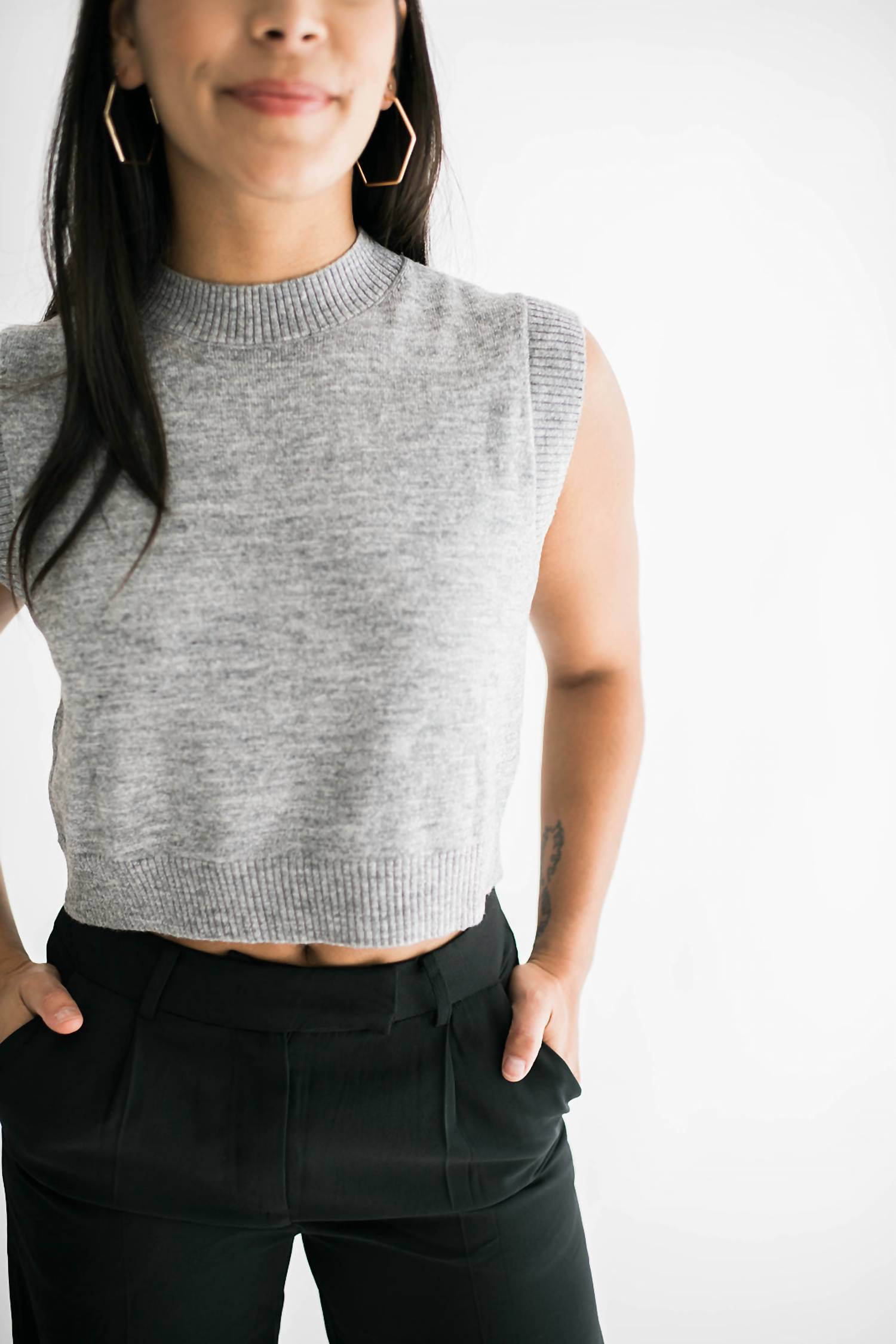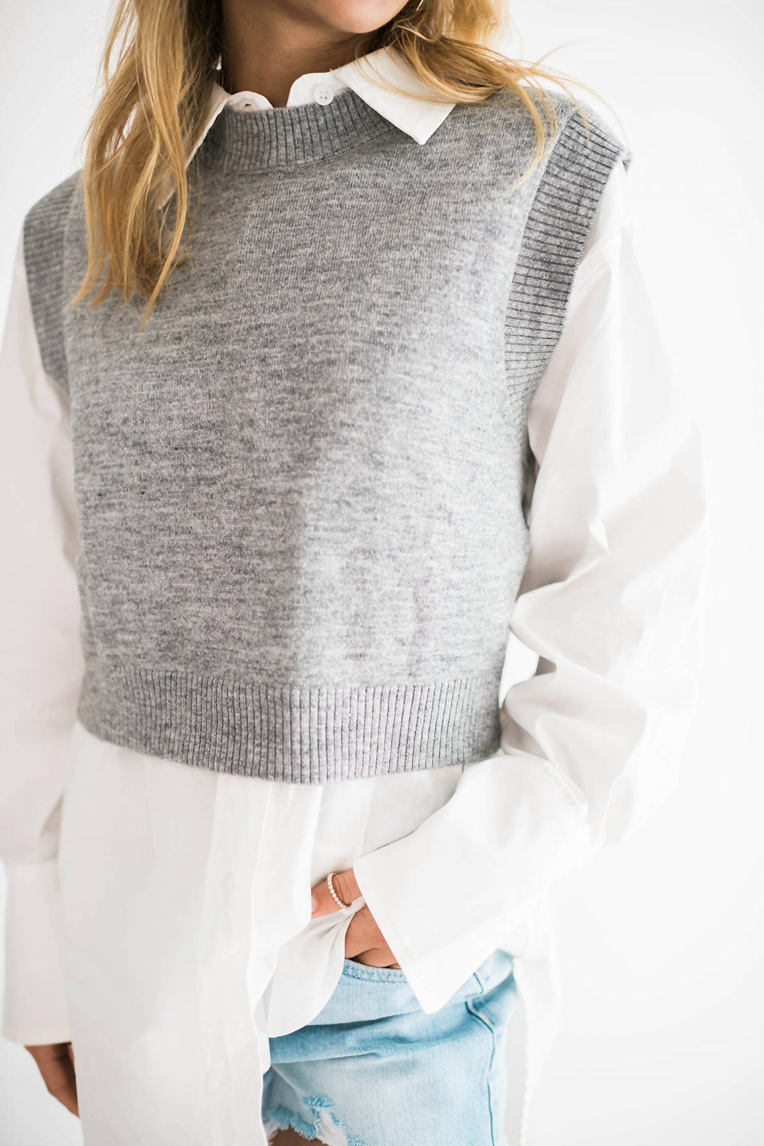 A vest so versatile you can mix and match it with almost any outfit and it will feel brand new every time. Introducing the Amelia Vest by Falcon Park, a chic and versatile addition to your wardrobe in a neutral grey. This sleeveless vest features a crew neckline and ribbed hem and neckline, crafted from 100% acrylic for a comfortable fit. Ideal for layering, it offers a pull-on closure, making it a perfect choice for preppy fall fashion. Care is simple with machine wash and tumble dry instructions, making it an easy staple for any back-to-school look. Model is wearing a size small (5'8" height, 32" bust, 25" waist, 34" hip).