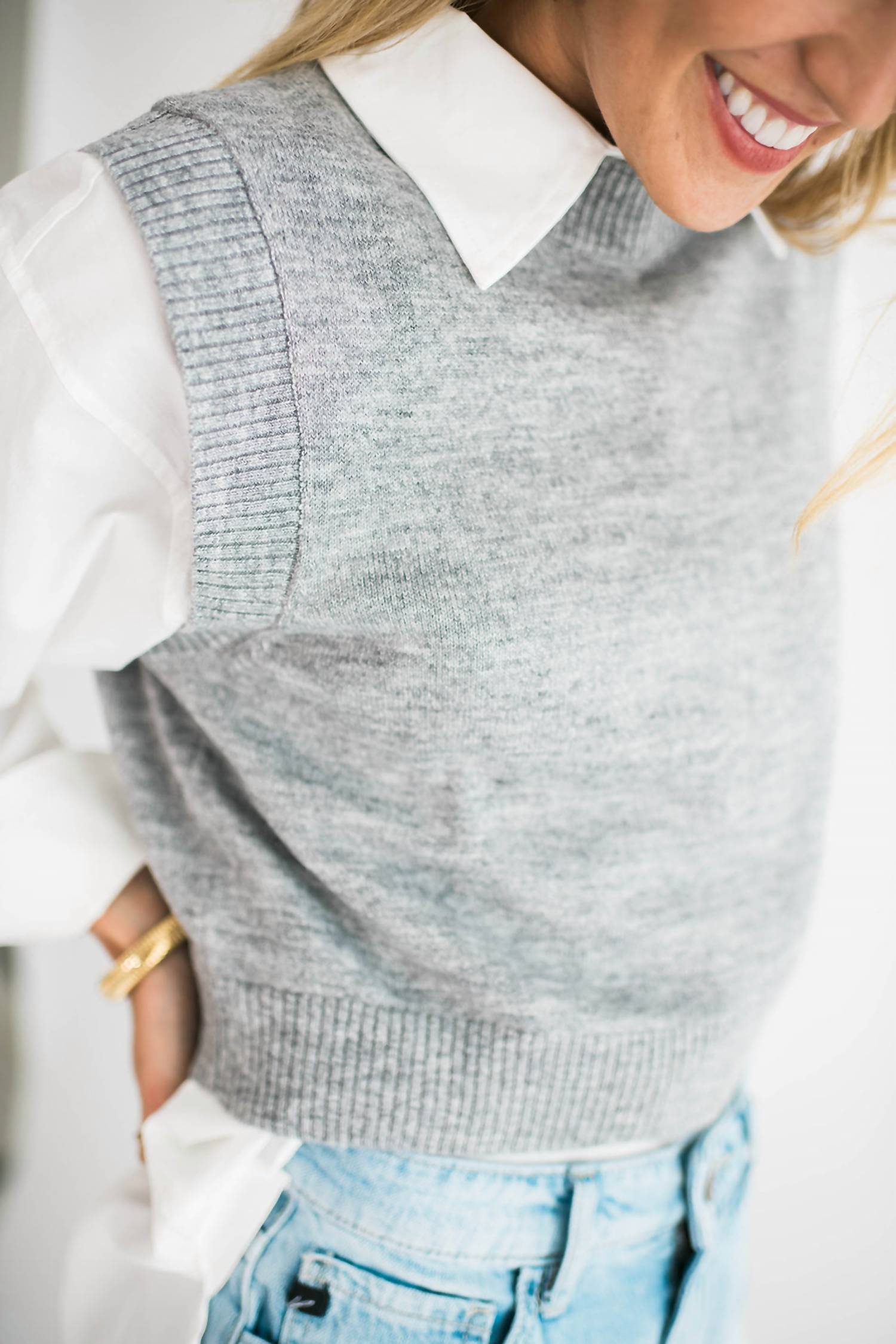 Introducing the Amelia Vest by Falcon Park, a chic and versatile addition to your wardrobe in a neutral grey. This sleeveless vest features a crew neckline and ribbed hem and neckline, crafted from 100% acrylic for a comfortable fit. Ideal for layering, it offers a pull-on closure, making it a perfect choice for preppy fall fashion. Care is simple with machine wash and tumble dry instructions, making it an easy staple for any back-to-school look. Model is wearing a size small (5'8" height, 32" bust, 25" waist, 34" hip).