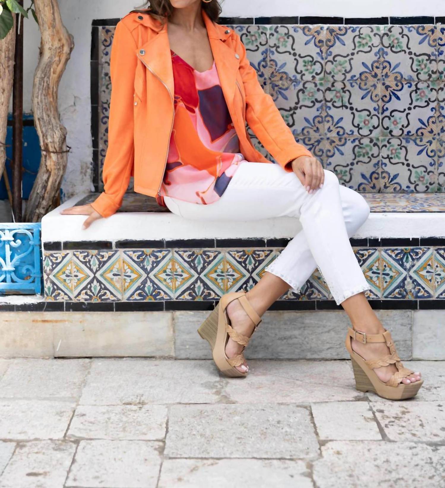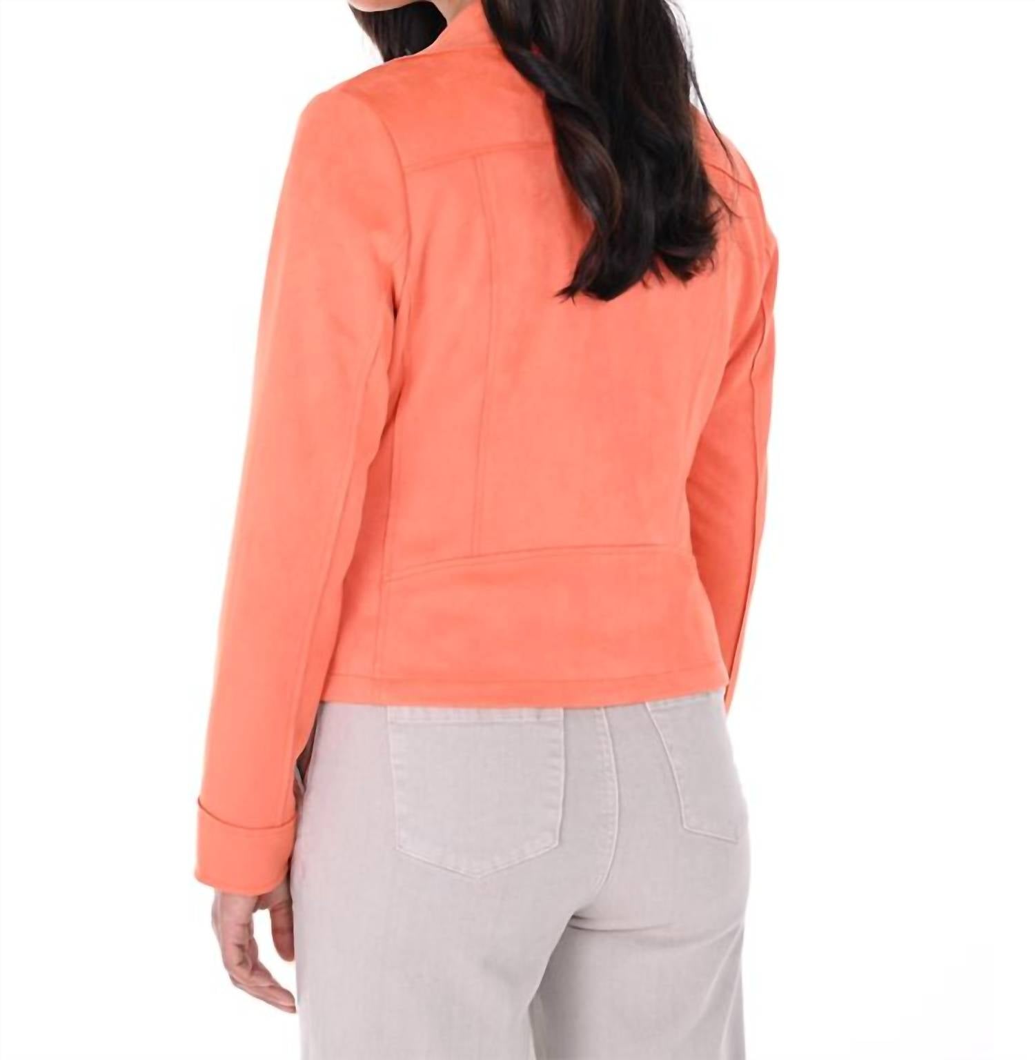 Nothing is cooler than this vintage inspired bomber jacket. The Frank Lyman 246214U Orange Faux Suede Jacket is a 90% polyester, 10% elastane jacket made in Canada. It features a brushed knit construction, pockets, silver zipper details, and measures approximately 22 inches in length with 24-inch sleeves. The jacket is unlined and should be hand washed in cold water.