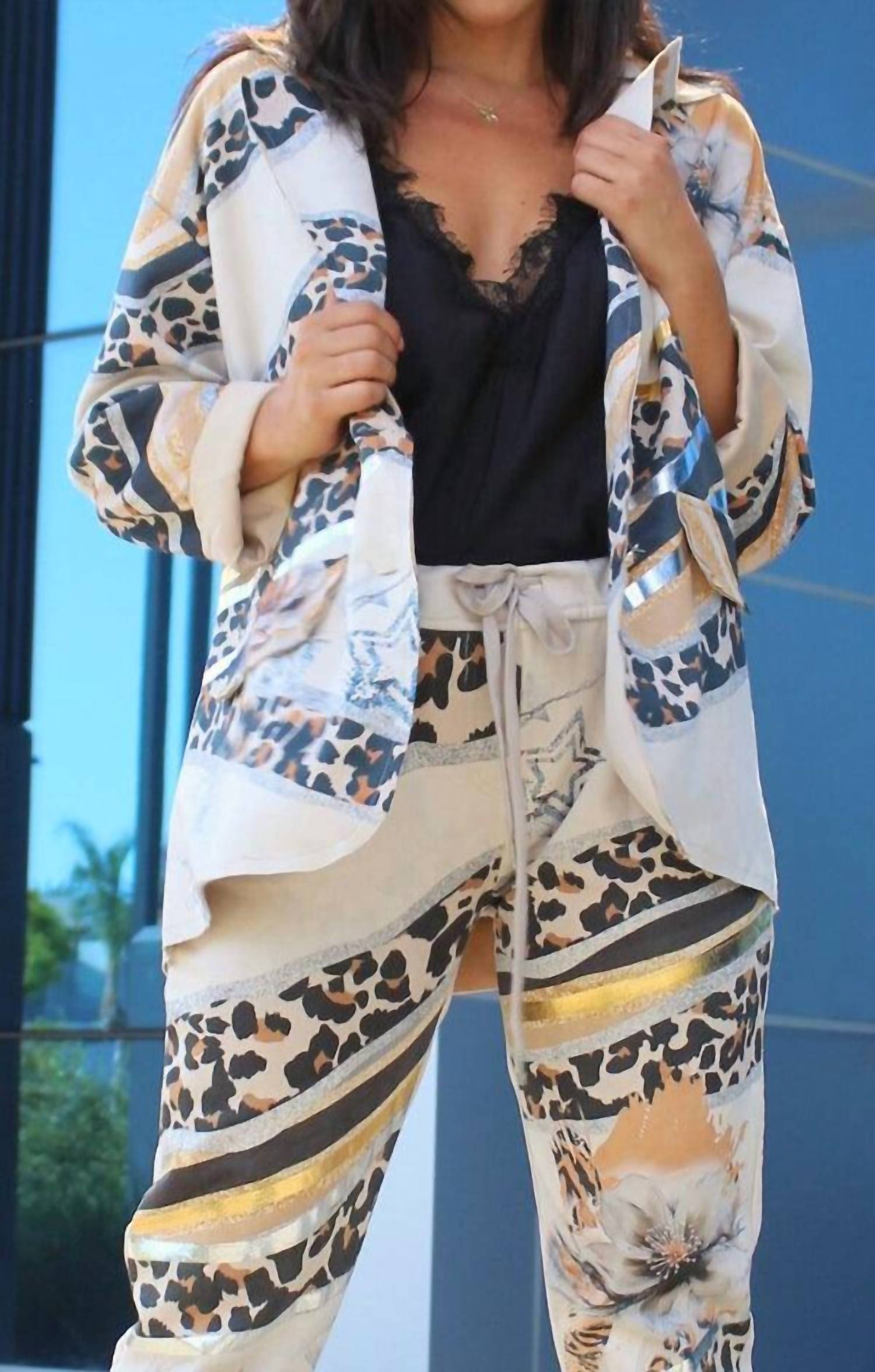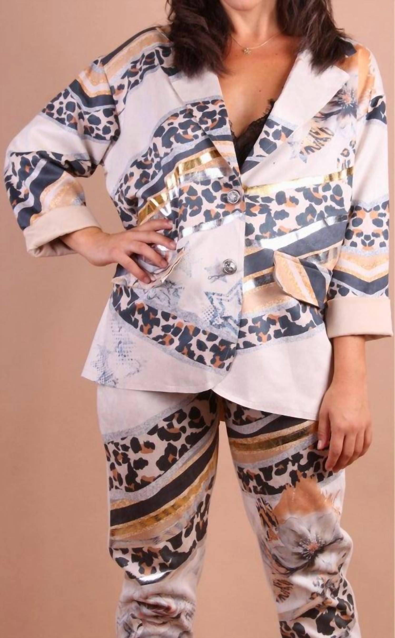 Tailored to perfection, this blazer will be your go-to jacket for years to come. Elevate your workwear with the GIGI MODA Figo Blazer, a chic faux suede piece in a sophisticated beige featuring an eye-catching leopard print pattern. This long-sleeve blazer is crafted from a comfortable viscose blend with 60% Viscose, 35% Polyester, and 5% Elastic, offering a perfect fit in a one-size design. Made in Italy, it features stylish rolled sleeves, silver button closures, and two faux front pockets for a touch of practicality. The blazer makes a standout statement with metallic details and a V-neckline, ideal for fall fashion.