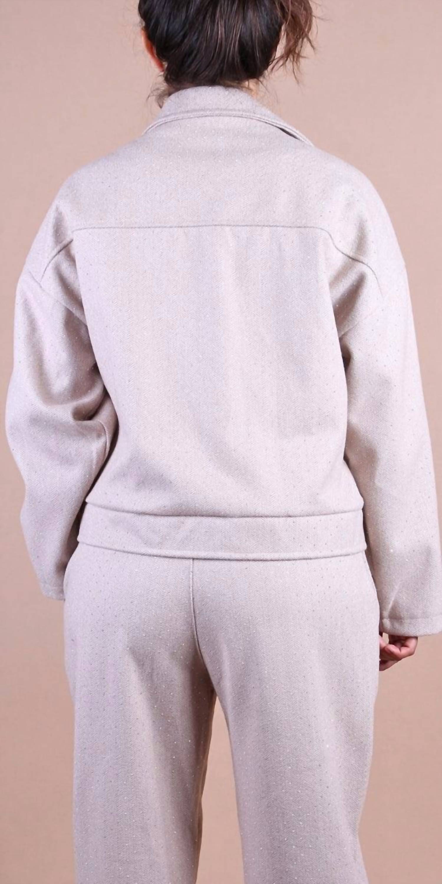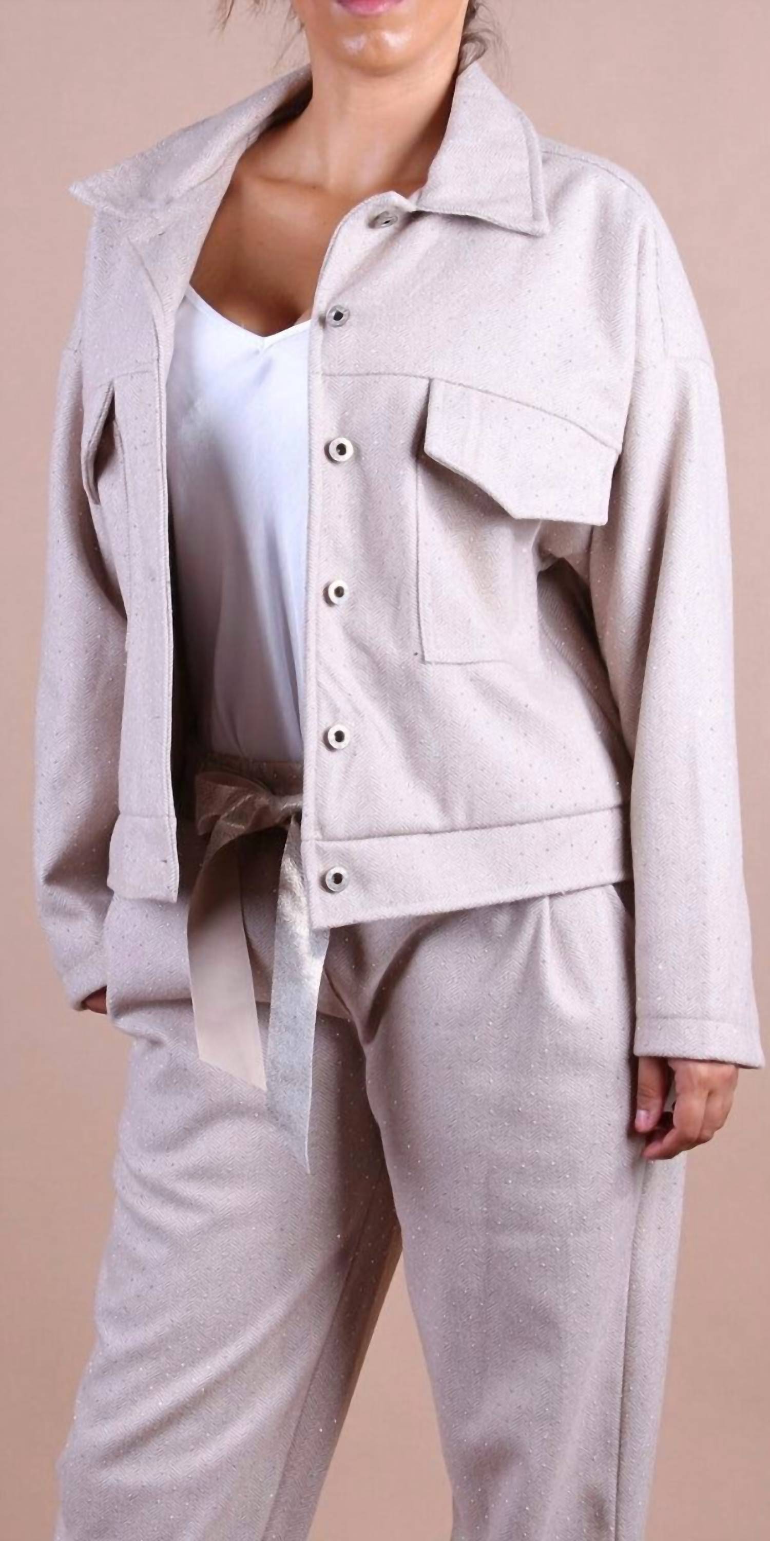 The coolest, most versatile utility jacket. Match it with your favorite pair of denim or throw it over any day dress. Introducing the GIGI MODA Gemma Jacket, a chic utility jacket perfect for fall's back-to-school season. Crafted from a fuzzy knit blend made of 60% polyester and 40% cotton, this long-sleeve jacket features a subtle chevron print adorned with mini rhinestones for a touch of glamour. Designed in beige, it includes two front utility pockets and a stylish collar neckline, making it both practical and fashionable. Made in Italy, the jacket offers button closure and is machine washable, ensuring easy care and durability.