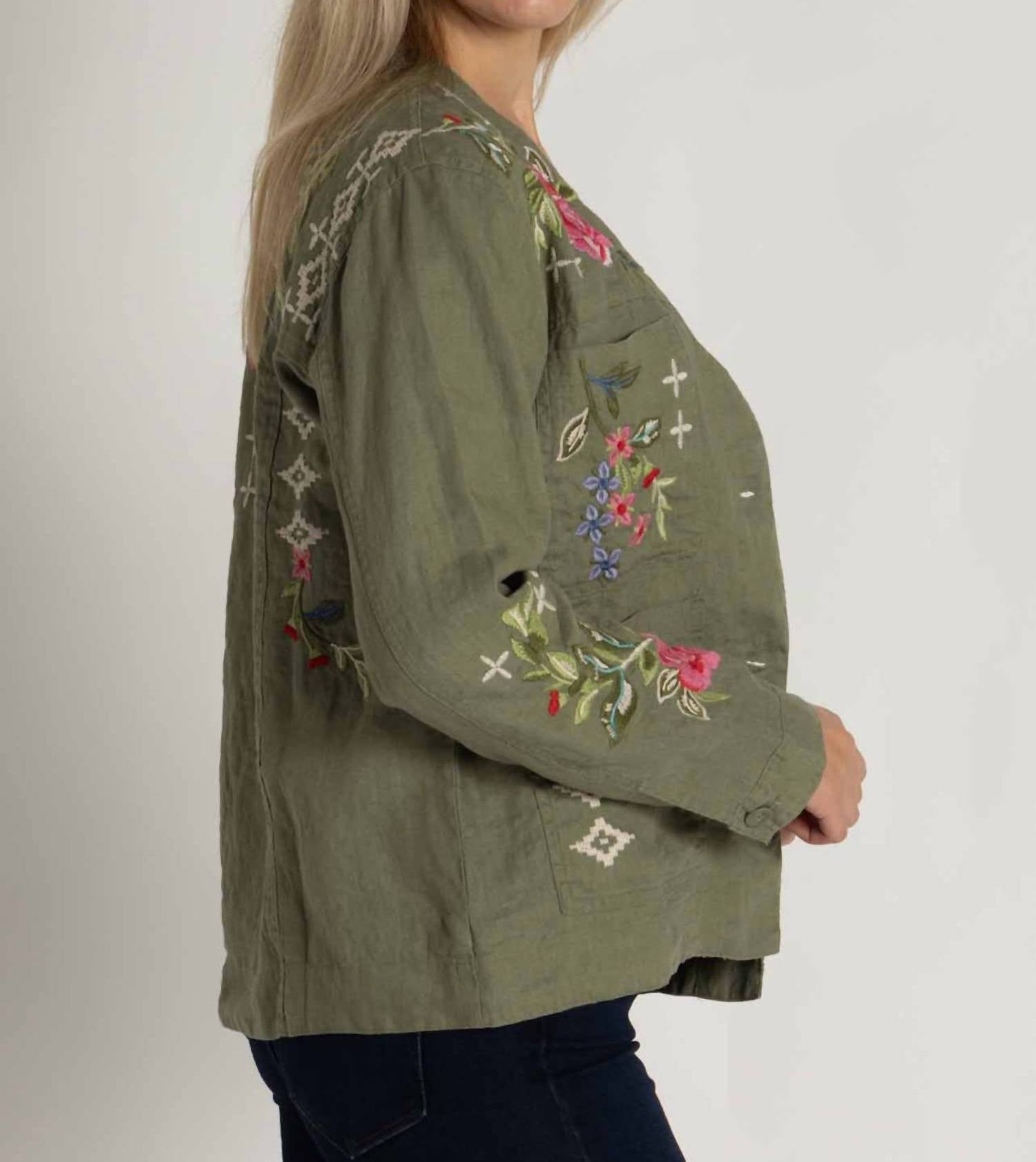 A jacket so versatile you can literally wear it with anything. Introducing the Women's Linen Workwear Jacket by Johnny Was, an elegant blend of style and functionality in tortoise. This casual jacket features long sleeves, a flattering V-neckline, and beautiful floral embroidery that adds a touch of boho chic to your spring wardrobe. Crafted from 100% linen, it includes functional pockets and a button closure for ease and convenience. Care instructions recommend machine washing to maintain its stunning design.