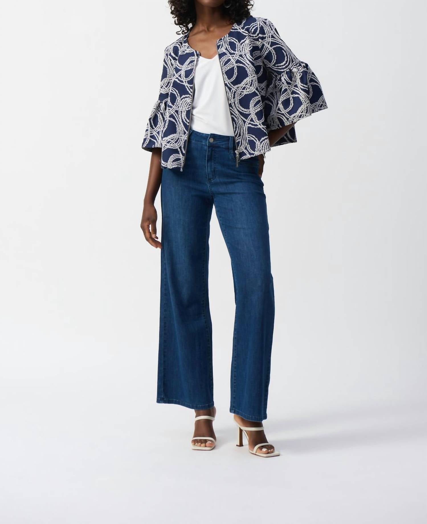 Make any outfit instantly cool by pairing it with this bomber jacket. Meet the Abstract Jacquard Trapeze Jacket by Joseph Ribkoff, a stylish addition to your spring wardrobe. This jacket features three-quarter ruffled sleeves and a sophisticated scoop neckline. Crafted from 39% cotton and 61% polyester jacquard fabric in a chic navy and off-white pattern, it offers a two-way zip closure for versatile styling. Care is convenient with hand washing in cold water and line drying in the shade.