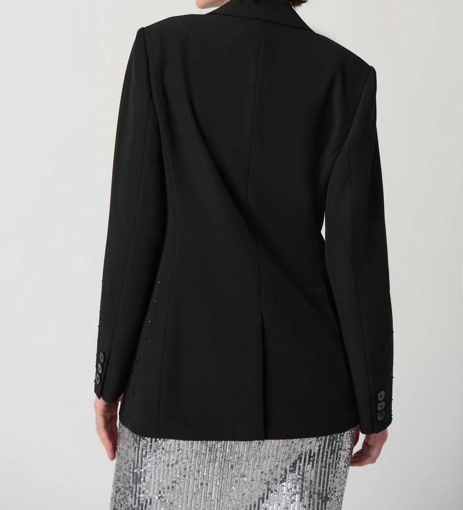 Tailored to perfection, this blazer will be your go-to jacket for years to come. Elevate your wardrobe with the Iron-on Embellished Style Blazer from Joseph Ribkoff, a sophisticated choice for black-tie events. This women's blazer, in textured black, features a notched collar and long straight sleeves, creating a sleek and polished fit. Crafted from polyester, it is fully lined and fastens with a single button closure. Care instructions include hand washing in cold water with like colors and laying flat to dry in the shade, ensuring this statement piece remains immaculate. Model is 5'10'' and wearing size 6.