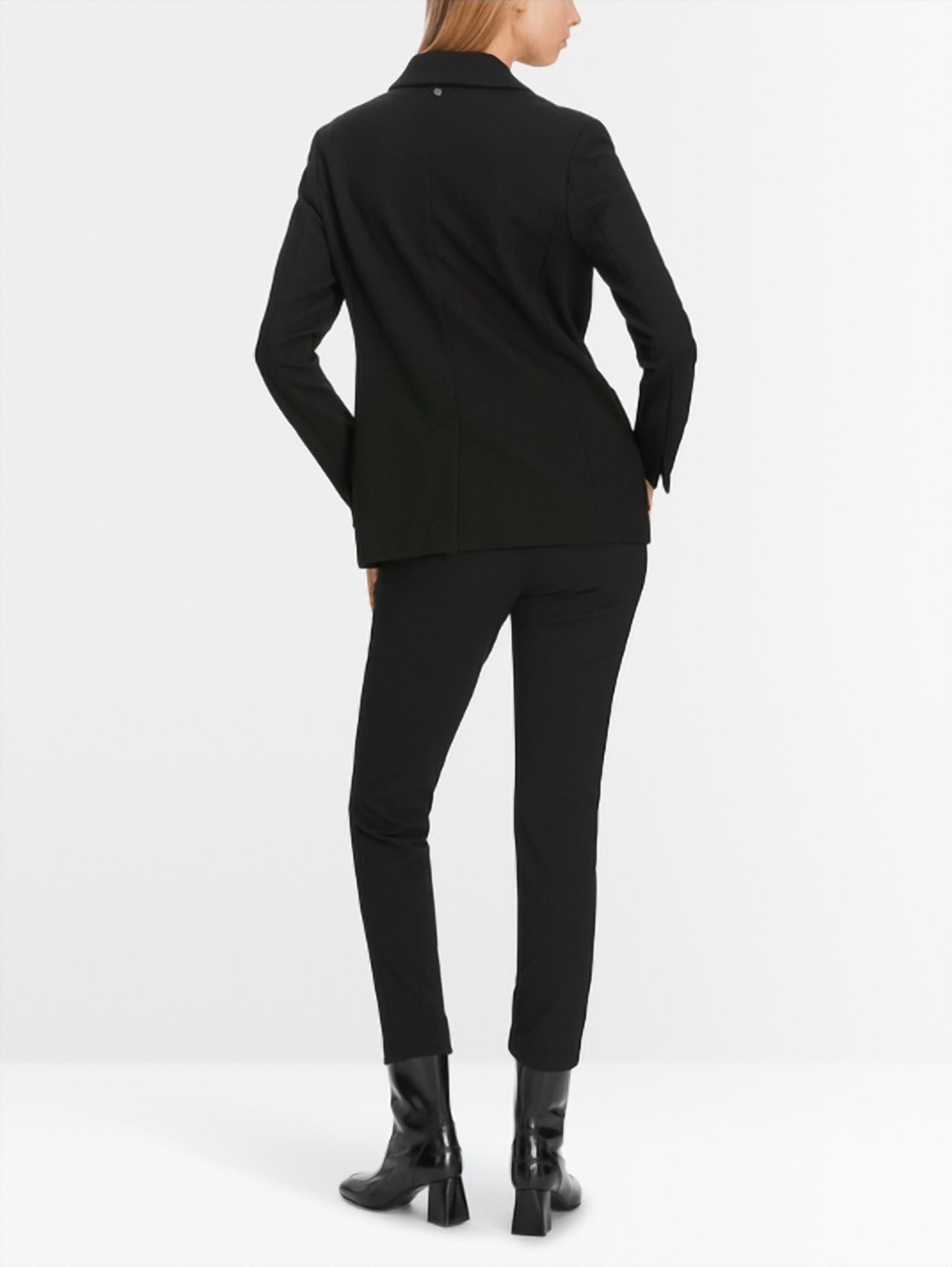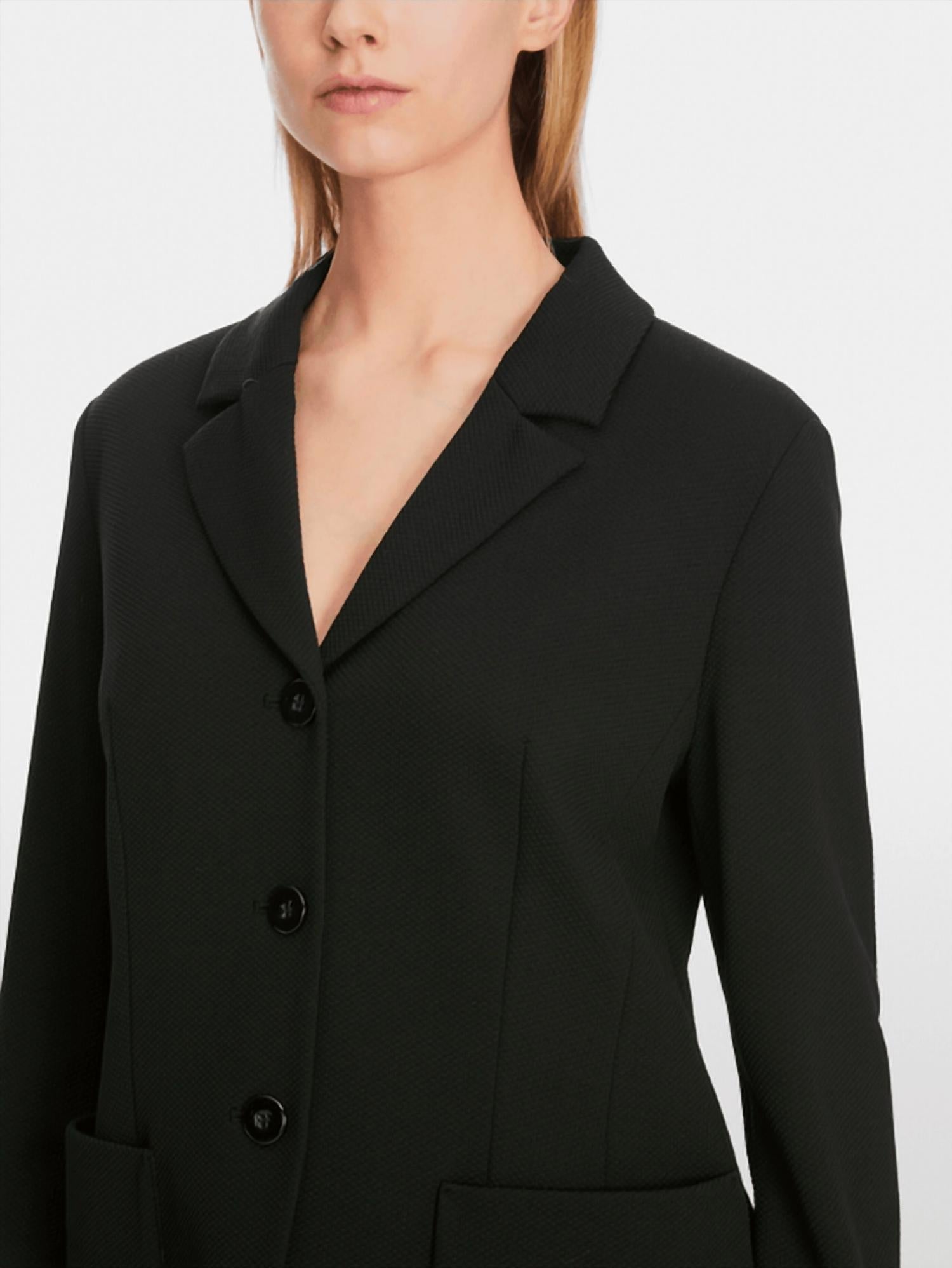 This timeless blazer is crafted from a soft, textured fabric blend with added stretch for comfort and ease. Designed in a single-breasted style with short lapels and a three-button fastening, it features Viennese seams and darts that create a flattering, figure-hugging silhouette. Finishing touches include two patch pockets and refined slit sleeves, making it a versatile piece that never goes out of style. Made with a composition of 93% polyamide and 7% elastane, sleeve lining of 100% polyester, and back lining of 94% cupro and 6% elastane.