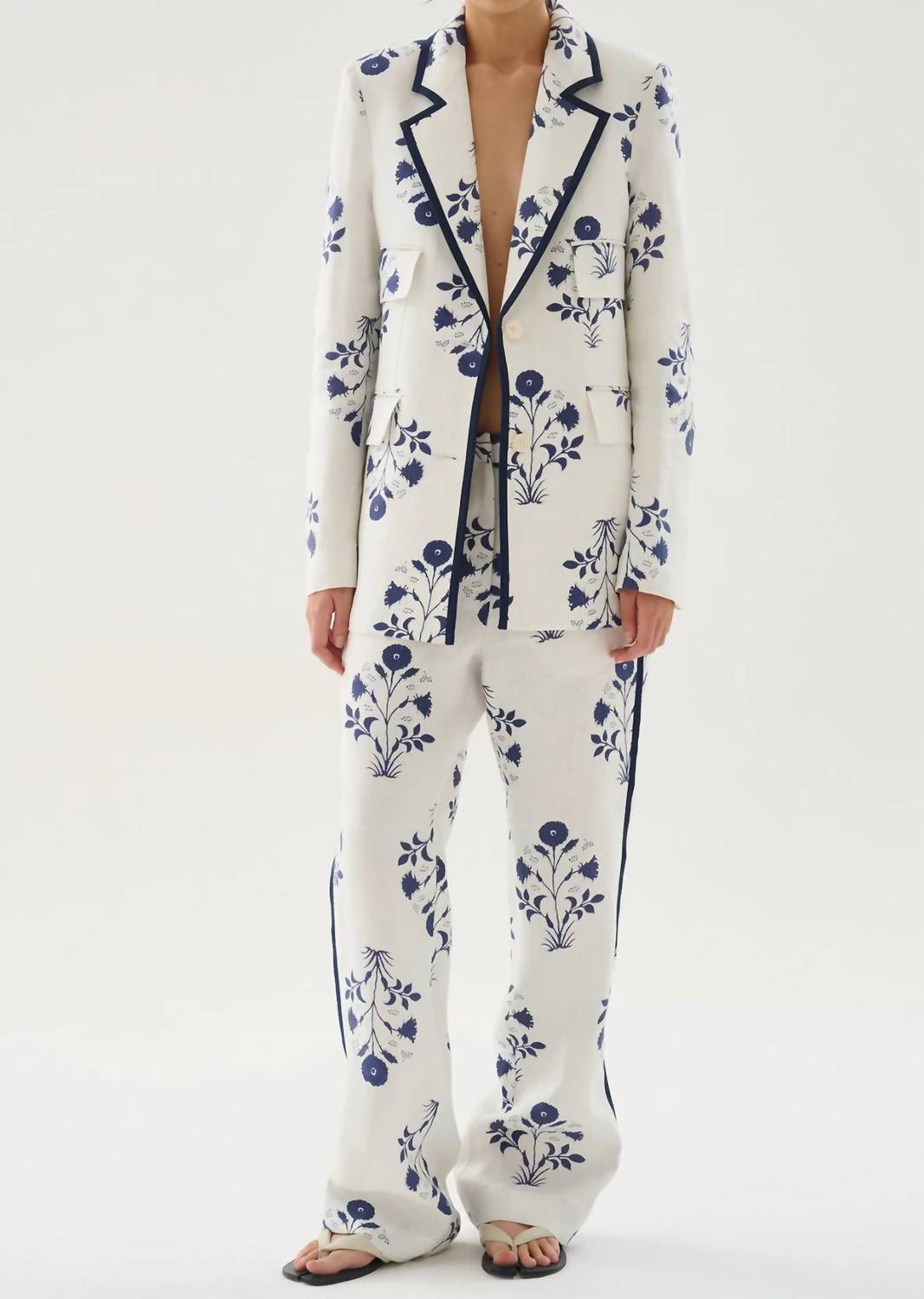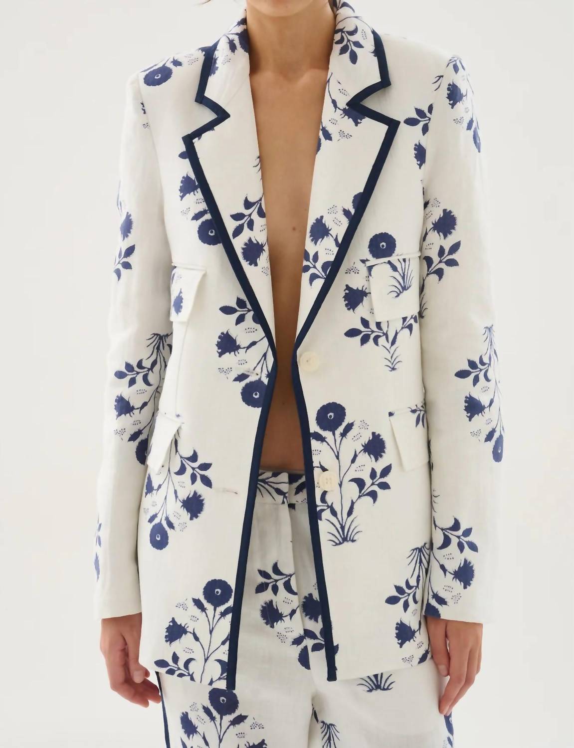 Elevate your wardrobe with the Bolson Sawyer Blazer by Maria Cher, an exquisite choice for the Spring season. Featuring a long sleeve design, this blazer is crafted from 100% washed linen and showcases a striking floral pattern in deep blue hues. Its elongated silhouette and sharp lapels with contrast piping make it a perfect addition for a holiday party or any sophisticated occasion. Closure: Button closure. Care: Dry clean only.
