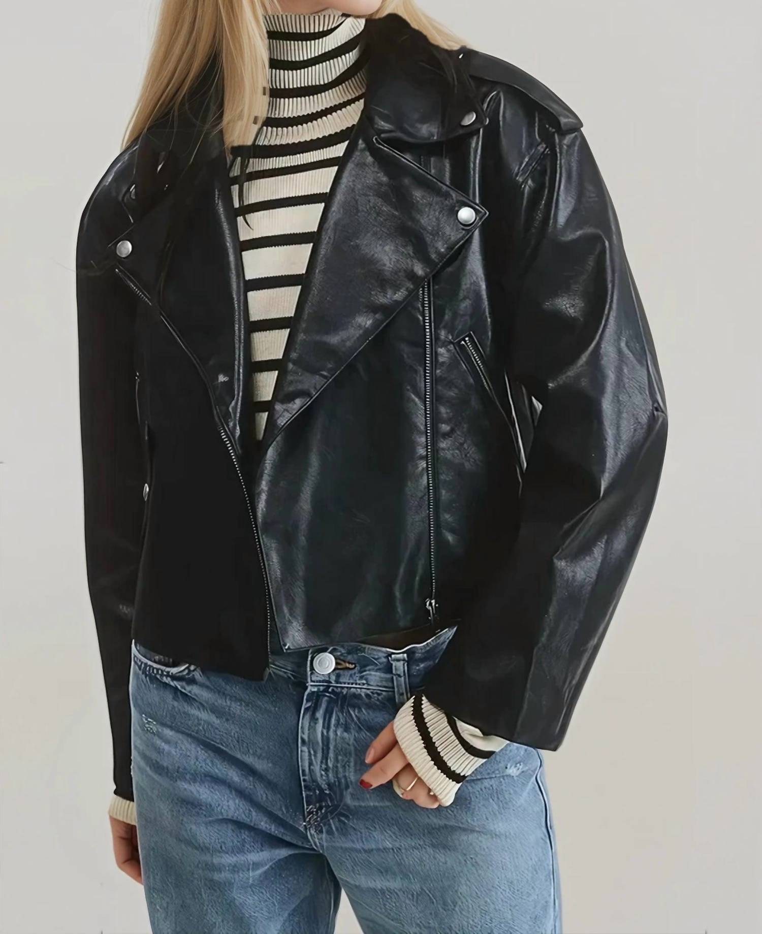Soft leather, impeccable design. This leather jacket is a win-win. Elevate your outerwear collection with the Buenos Aires Leather Jacket by Mimosa, crafted for effortless style in timeless black. This oversized jacket features long sleeves and a stylish notch collar, designed in a premium blend of 55% Cotton and 45% PU for a minimalist solid look. With a convenient front zip closure, this faux leather piece stands as an ideal layering option throughout the seasons. Care for its sleek appearance through dry cleaning, ensuring its longevity and continued versatility.