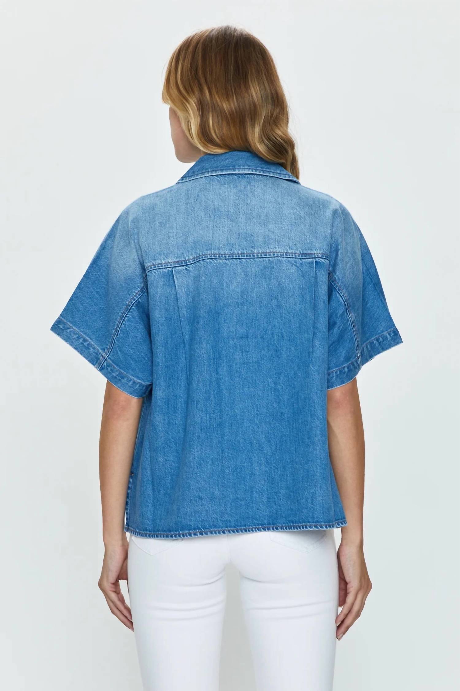 A vest so versatile you can mix and match it with almost any outfit and it will feel brand new every time. Discover the Bella Denim Vest by PISTOLA, a chic addition to any wardrobe with its relaxed fit and camp collar neckline. Tailored in a solid, medium blue denim wash, this vest features short sleeves and an exaggerated, dropped shoulder design. Made from a cotton blend with 62% Cotton and 38% Cotton Lyocell, it boasts a stylish high-low split crop length. For care, please dry clean this garment.