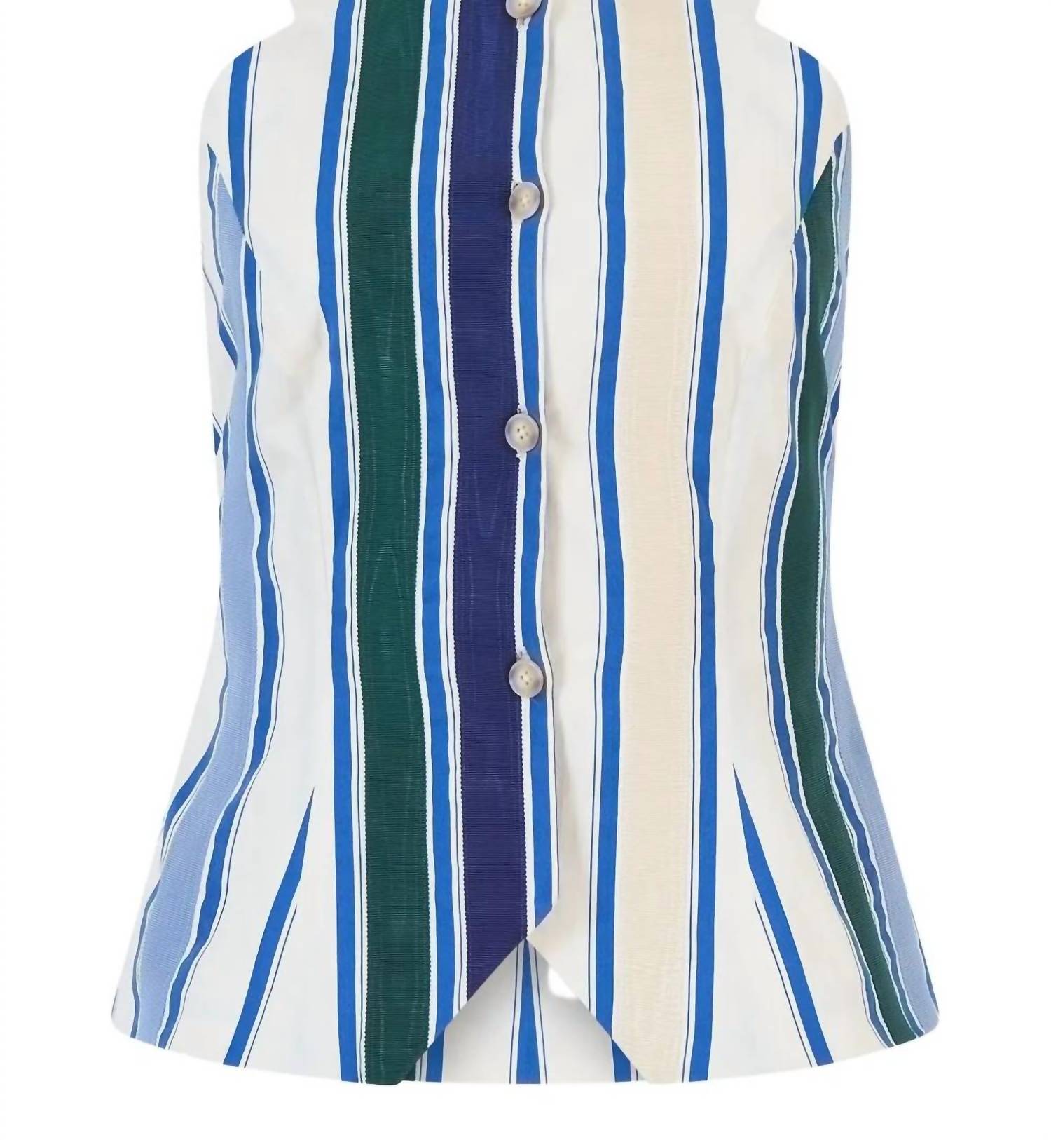 The Ribbon King Giorgio Vest by Rosie Assoulin is the epitome of structured style with a contemporary twist. This sleeveless vest, crafted from a cotton blend with 85% cotton and 15% polyamide, showcases bold blue stripes for a striking look. Made in NYC, it features a button closure and cutout shoulders for a refined, playful touch. Care instructions recommend dry cleaning to maintain its tailored appeal.