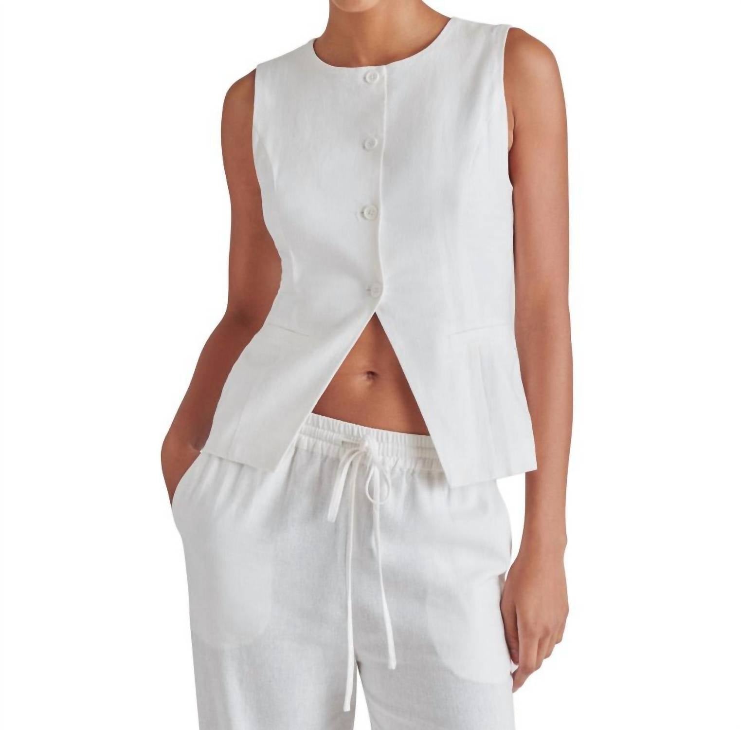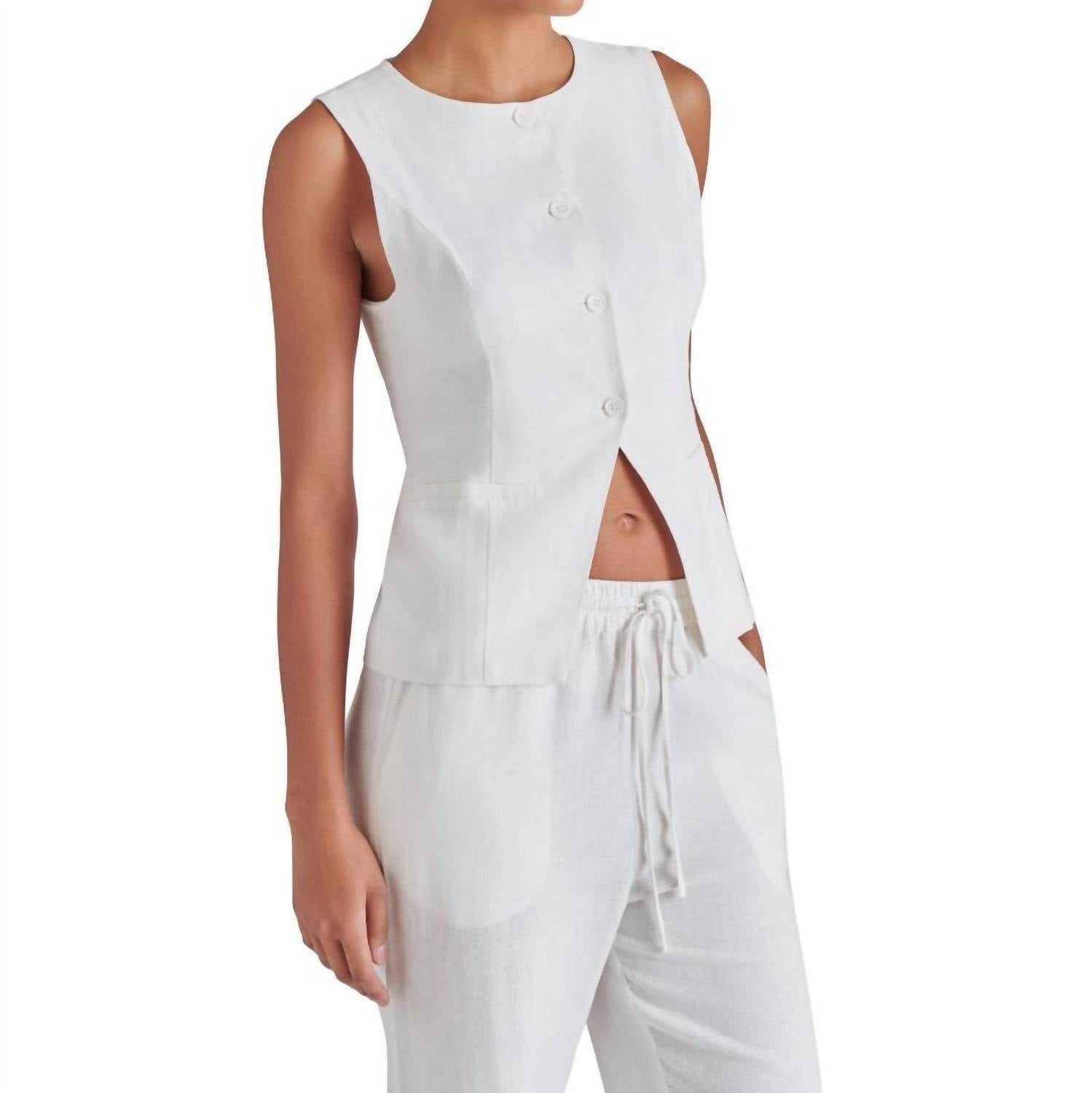 A vest so versatile you can mix and match it with almost any outfit and it will feel brand new every time. Discover the Button Up Vest Top by Steve Madden, an essential for any wardrobe with its professional and versatile design. This sleek white vest top is sleeveless and crafted from a high-quality linen blend, composed of 55% linen and 45% rayon, offering both comfort and style. Featuring a solid pattern and functional button closure, it’s easy to pair with various pieces for a complete look. Care for this must-have top is straightforward with machine washing recommended.