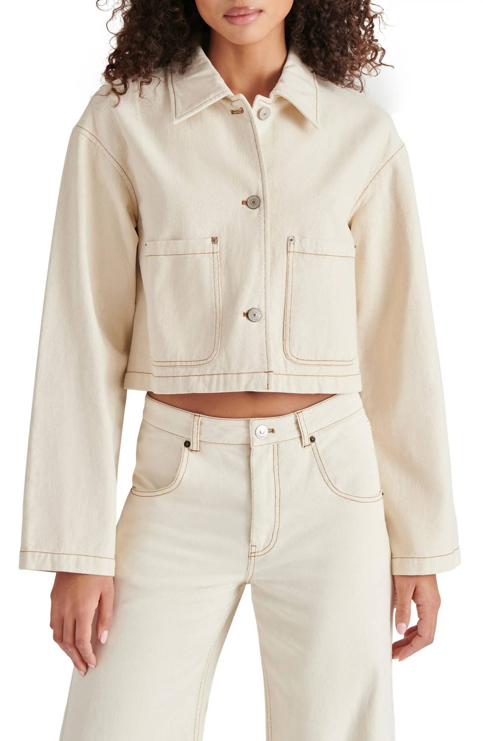 Throw this adorable jacket over just about anything for an effortlessly stylish look. Elevate your wardrobe with the Myrtha Denim Crop Chore Jacket by Steve Madden, designed in a stylish oatmeal hue. This long-sleeve jean jacket is crafted from comfortable cotton, perfect for adding a preppy touch to any casual or travel occasion. It features practical front patch pockets and a button closure, making it both functional and chic. Care for this piece is simple: machine wash and lay flat to dry.
