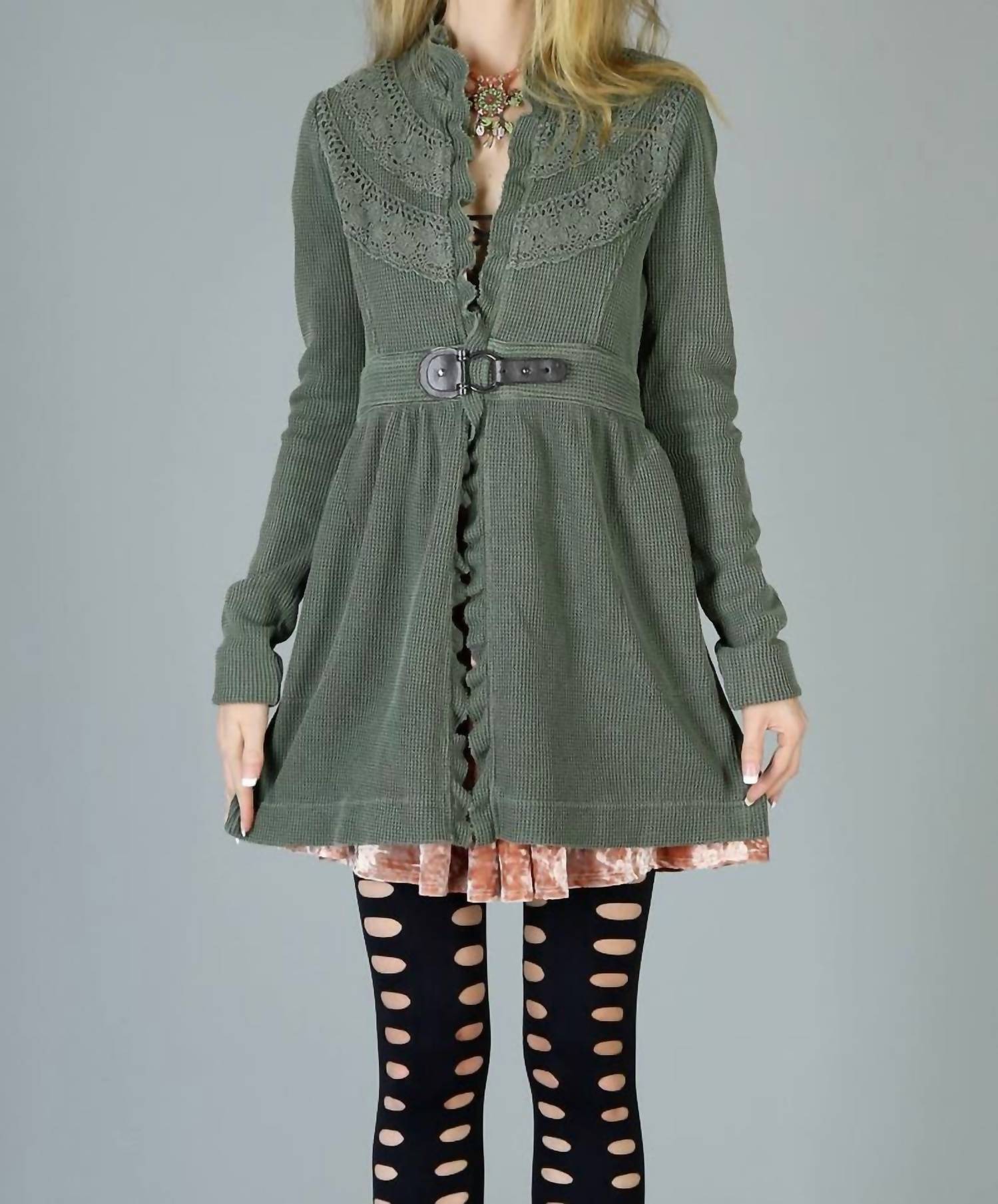 This boho jacket is crafted from soft cotton thermal knit and hand-dyed for a faded, vintage effect. Stretchy and comfortable like your favorite sweatshirt, it’s finished with cotton crochet lace at the chest, a vegan leather clasp, and side pockets for both charm and function.