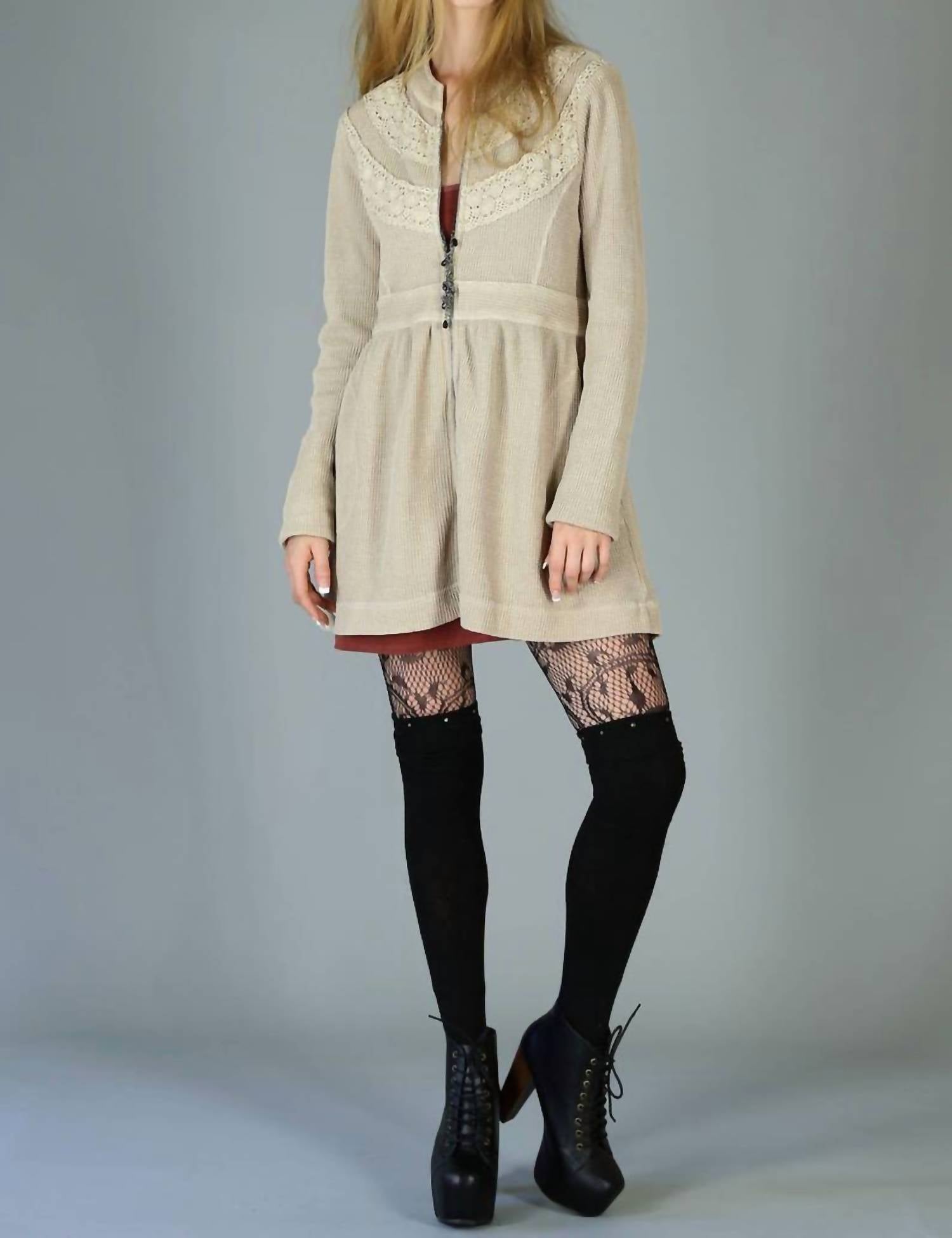 A casual yet cool jacket that every closset needs. This boho jacket is crafted from soft cotton thermal knit and hand-dyed for a faded, vintage effect. Stretchy and cozy like your favorite sweatshirt, it’s finished with cotton crochet lace at the chest, an antique brass zipper, and side pockets for a perfect blend of style and functionality.