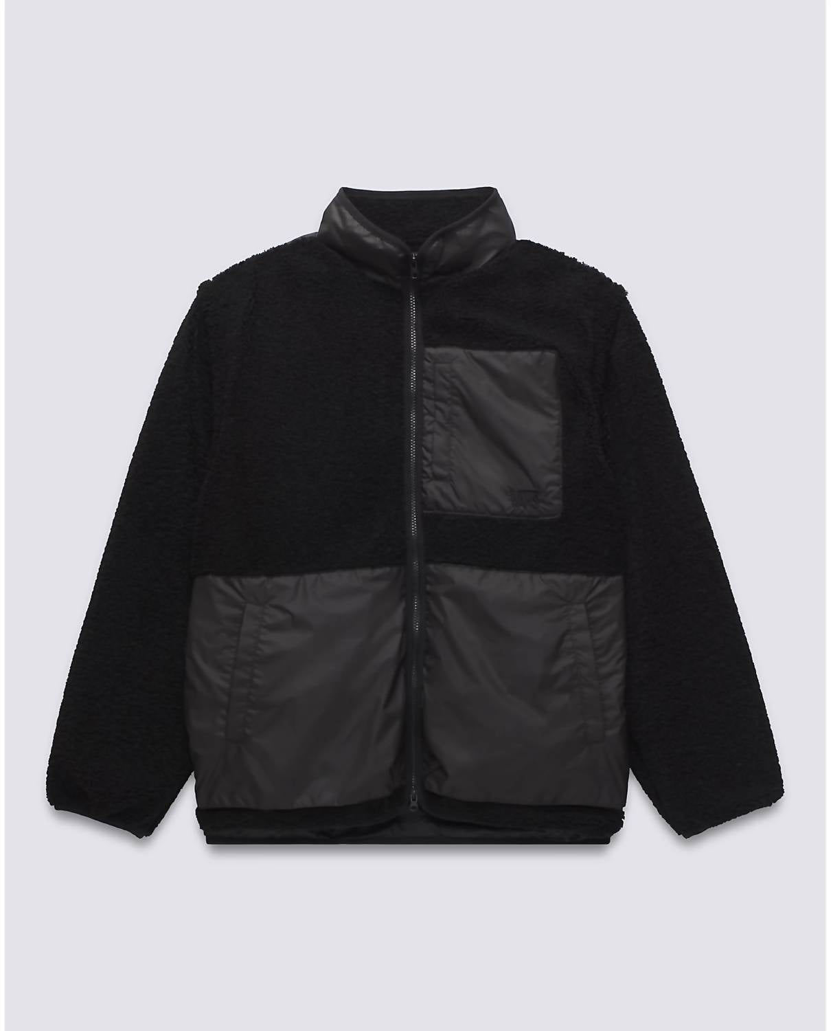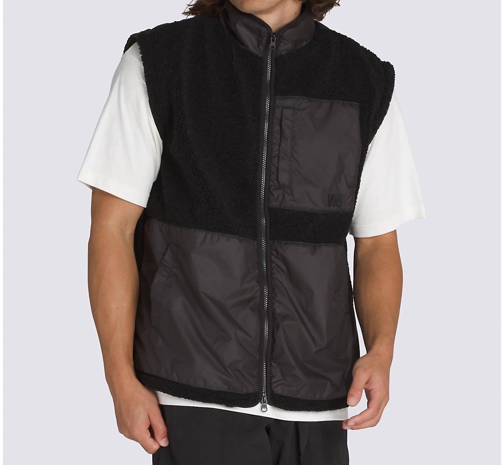The MTE Navigate Highpile Jacket by Vans is a versatile utility jacket designed for men, perfect for transitioning through the seasons. This solid black jacket features long sleeves that are removable, allowing it to transform into a vest for added versatility. Made from 100% polyester with Sherpa blocking and nylon piecing, it offers warmth and wind protection, while the Durable Water Repellant coating ensures you stay dry. Closure: Zip closure. Care: Machine wash, tumble dry.