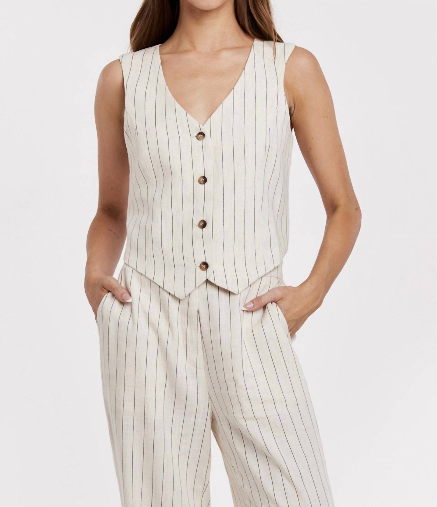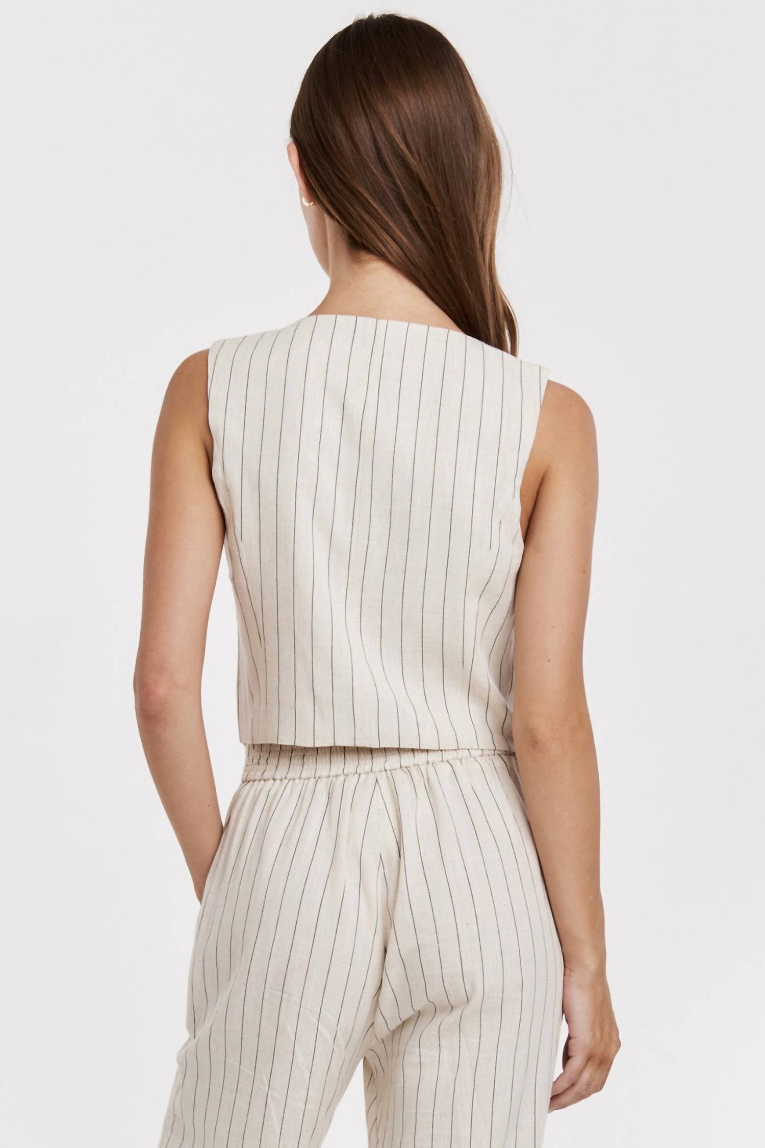 A vest so versatile you can mix and match it with almost any outfit and it will feel brand new every time. Introducing the Cecilia Novelty Vest by Another Love, a chic addition to any wardrobe. This sleeveless vest features a sophisticated V-neckline and a striking cream and black stripe pattern. Crafted from a linen blend, it offers comfort and style with a flattering tailored fit. Closure: Button closure. Perfect for spring occasions, such as a Thanksgiving holiday party, this minimalist piece ensures versatile styling.