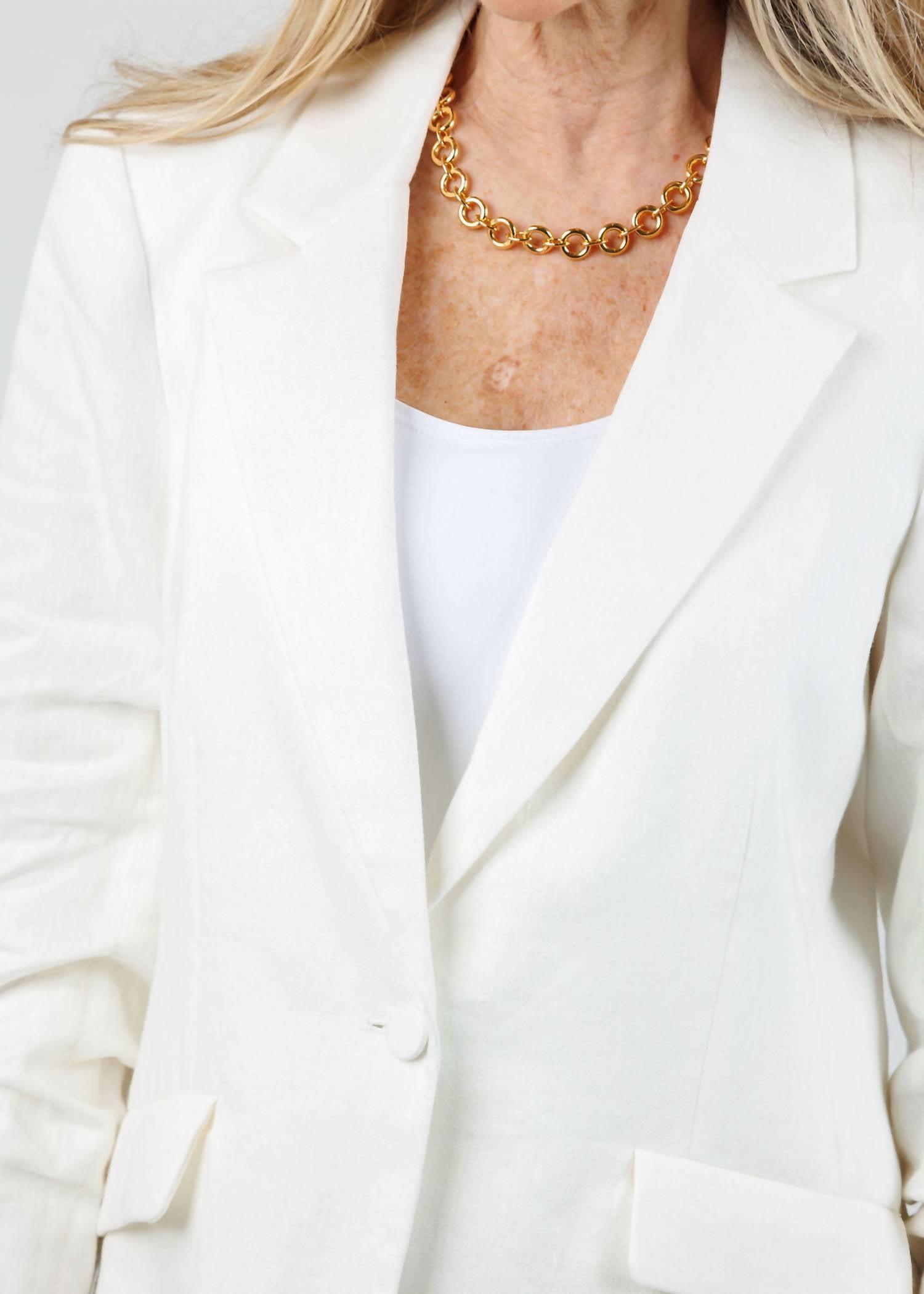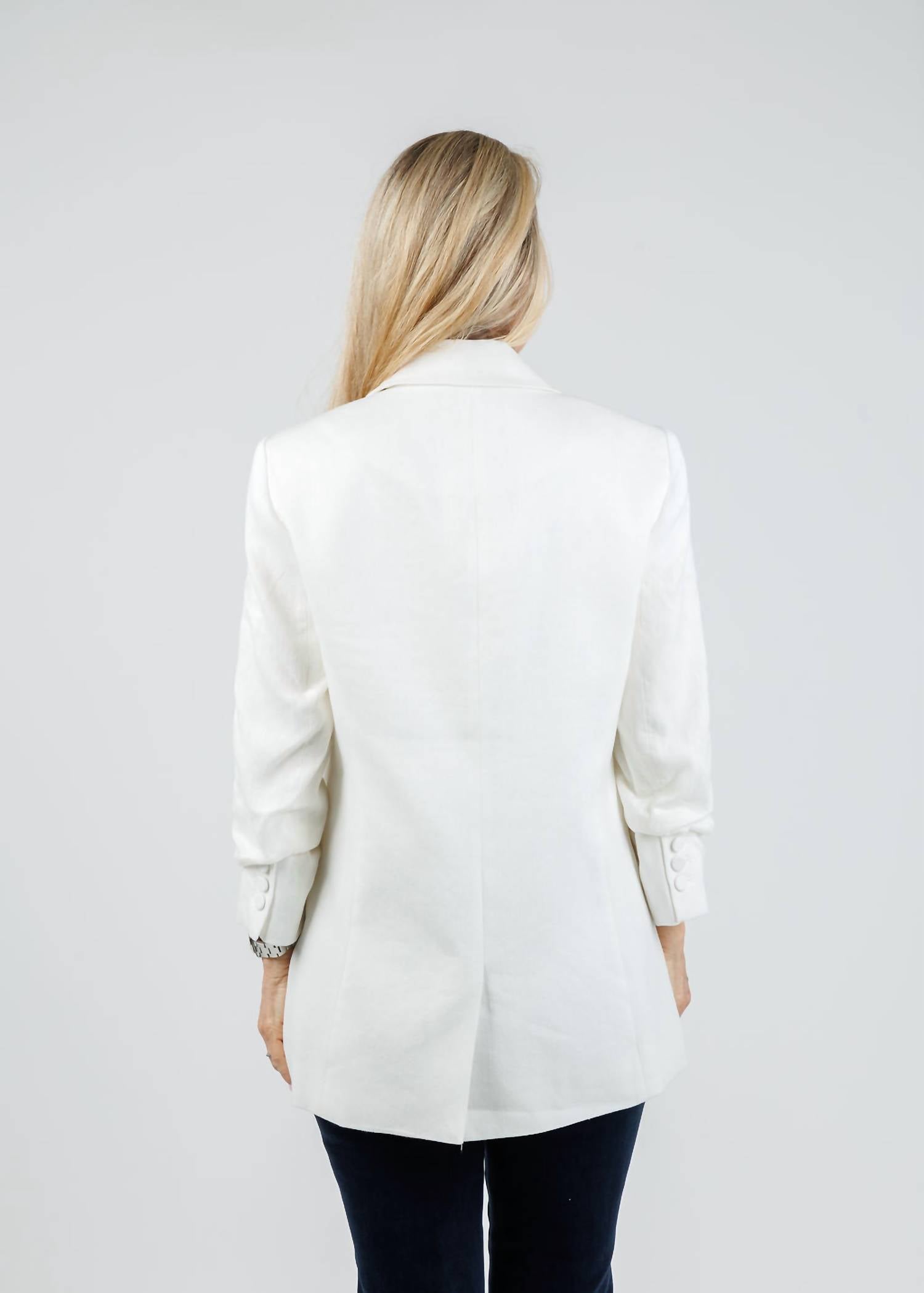 Introducing the Cinq à Sept Kylie Blazer in Ivory, a refined addition to your fall wardrobe. This blazer features long sleeves, crafted from a 53% Linen and 47% Cotton blend, providing a lightweight yet polished look. With its single button closure and classic notched lapels, it's perfect for layering over a variety of outfits, whether for travel or Thanksgiving. Care: Dry clean only. Model is wearing a size 4 (5'6" height, 34" bust, 25" waist, 34" hip).