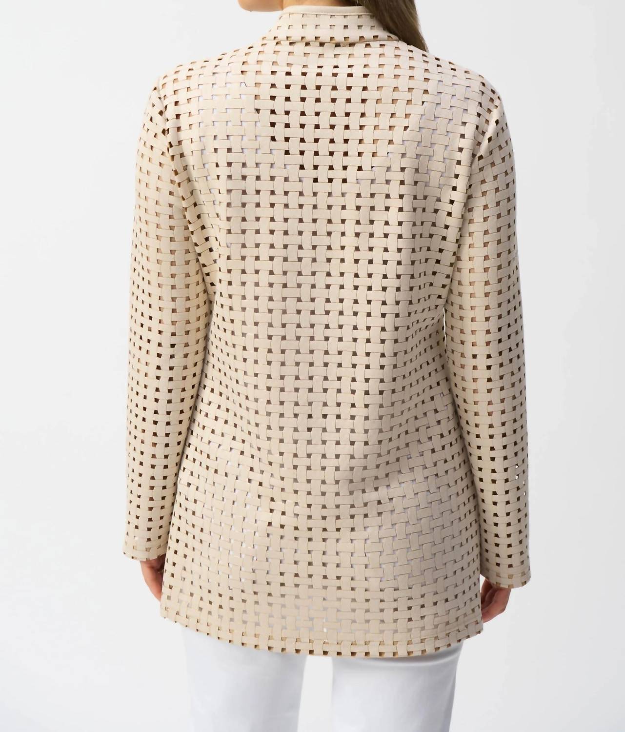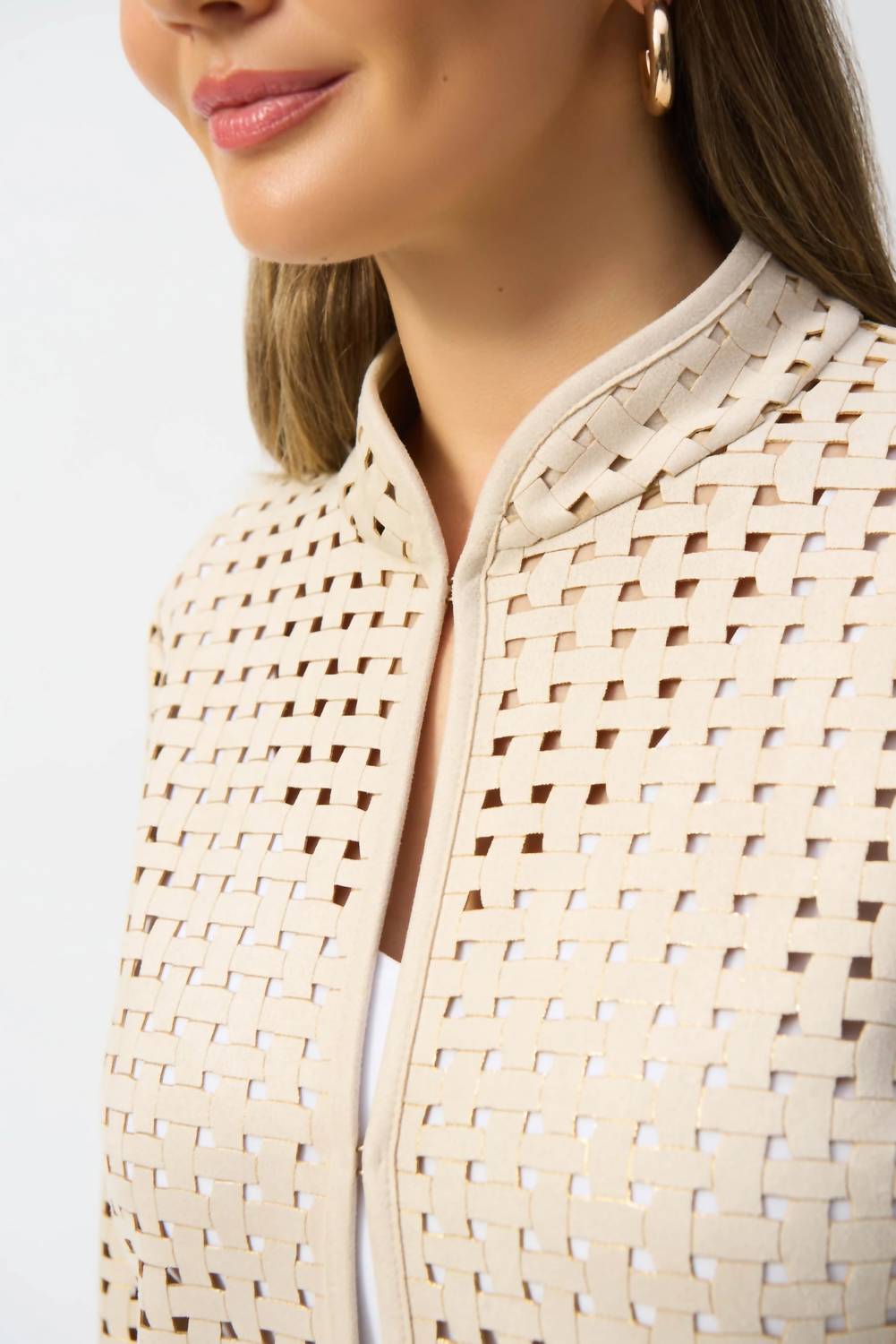 A casual yet cool jacket that every closset needs. Elevate your layering game with the Joseph Ribkoff Laser Cutout Suede Cover-up Jacket, a perfect blend of modern elegance and functionality. This beige/gold jacket features long sleeves and a structured stand collar, crafted from 95% polyester and 5% spandex for a comfortable fit. The unique check laser cutout design adds a textured appeal, completed with a sleek hook and eye closure. Made in Canada, care for this piece by hand washing in cold water, laying flat to dry in the shade, and avoiding ironing and dry cleaning.