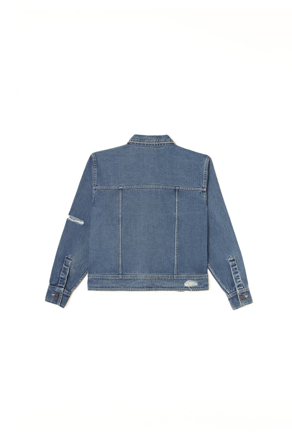 Classic, cool and works with almost any outfit choice. Introducing the Women's Stone Embossed & Distressed Denim Jacket by Sasha+Z, a statement piece for your dinner party ensemble. This stylish blue jacket features long sleeves and a traditional collar with a crystal sunburst embellishment for added flair. Made from premium cotton denim, it includes dual chest pockets and a button closure, enhanced by artful distressing and contrast stitching. Crafted with eco-friendly materials, this jacket is machine washable cold inside out for easy care.