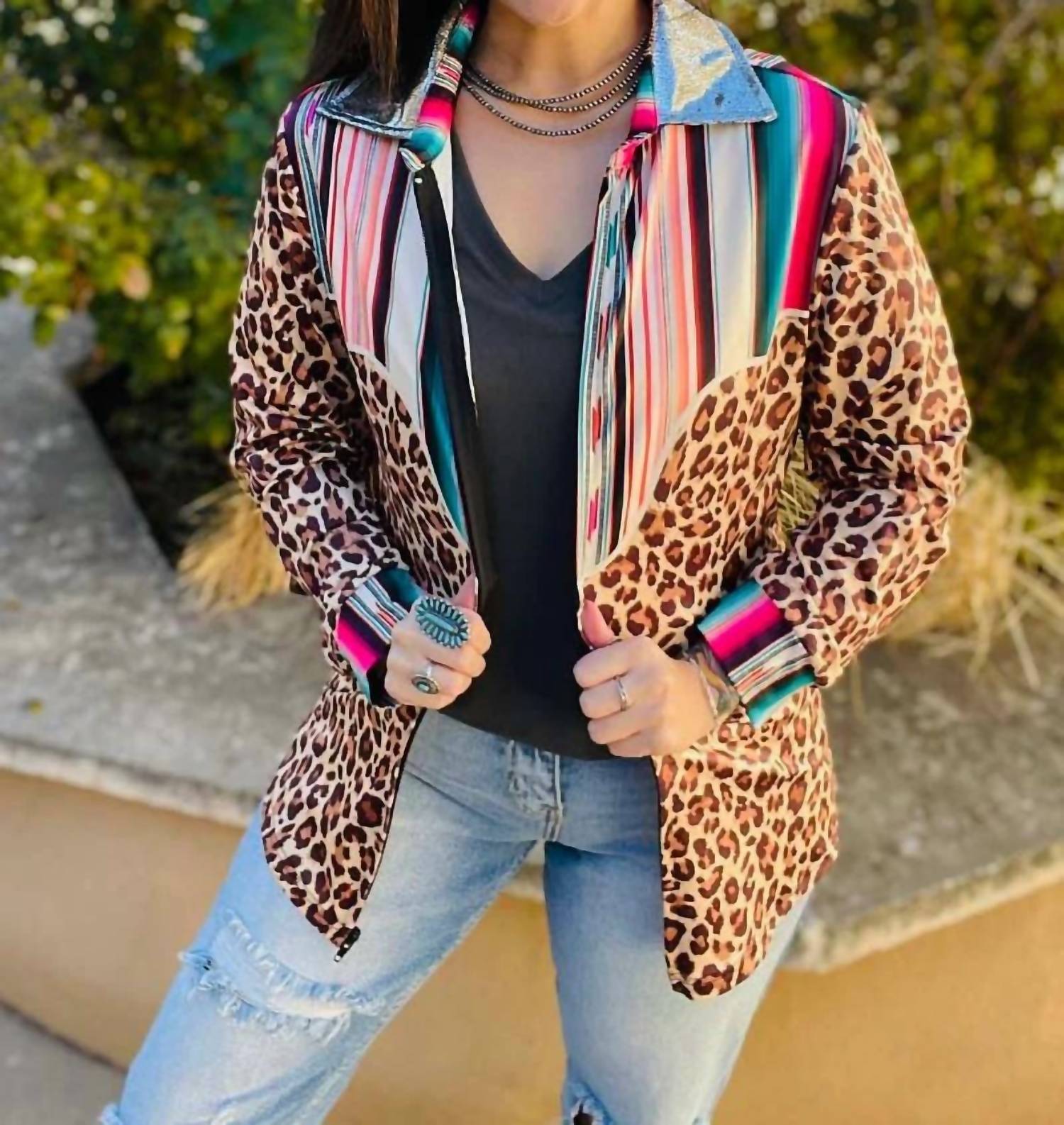 A jacket so versatile you can literally wear it with anything. This jacket boasts long sleeves and a remarkable metallic collar, complemented by serape and cheetah details for a bold aesthetic. Crafted from 80% Polyester and 20% Spandex, it ensures both comfort and style. The garment length is 26.75 inches, perfect for versatile layering.