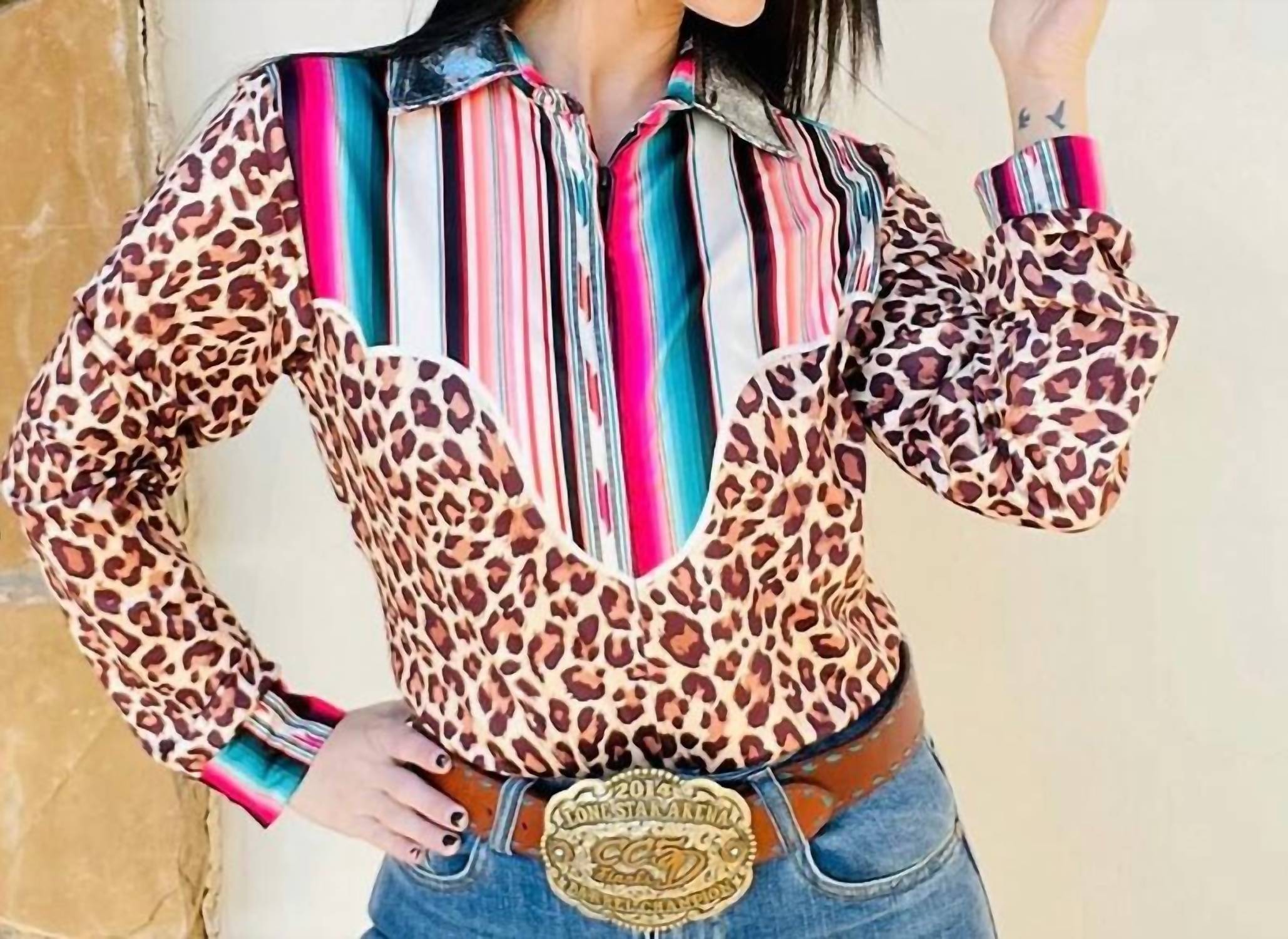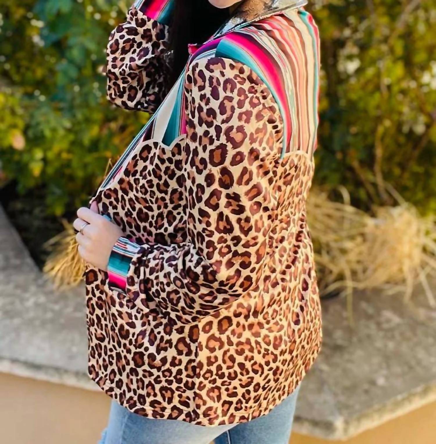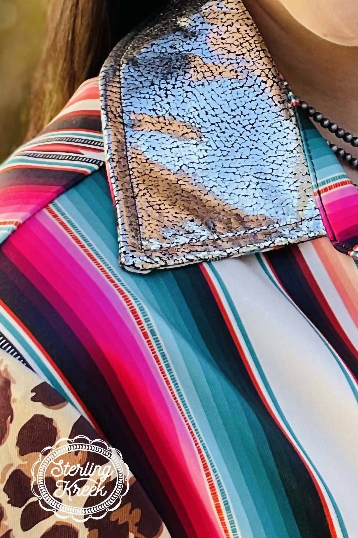 This jacket boasts long sleeves and a remarkable metallic collar, complemented by serape and cheetah details for a bold aesthetic. Crafted from 80% Polyester and 20% Spandex, it ensures both comfort and style. The garment length is 26.75 inches, perfect for versatile layering.