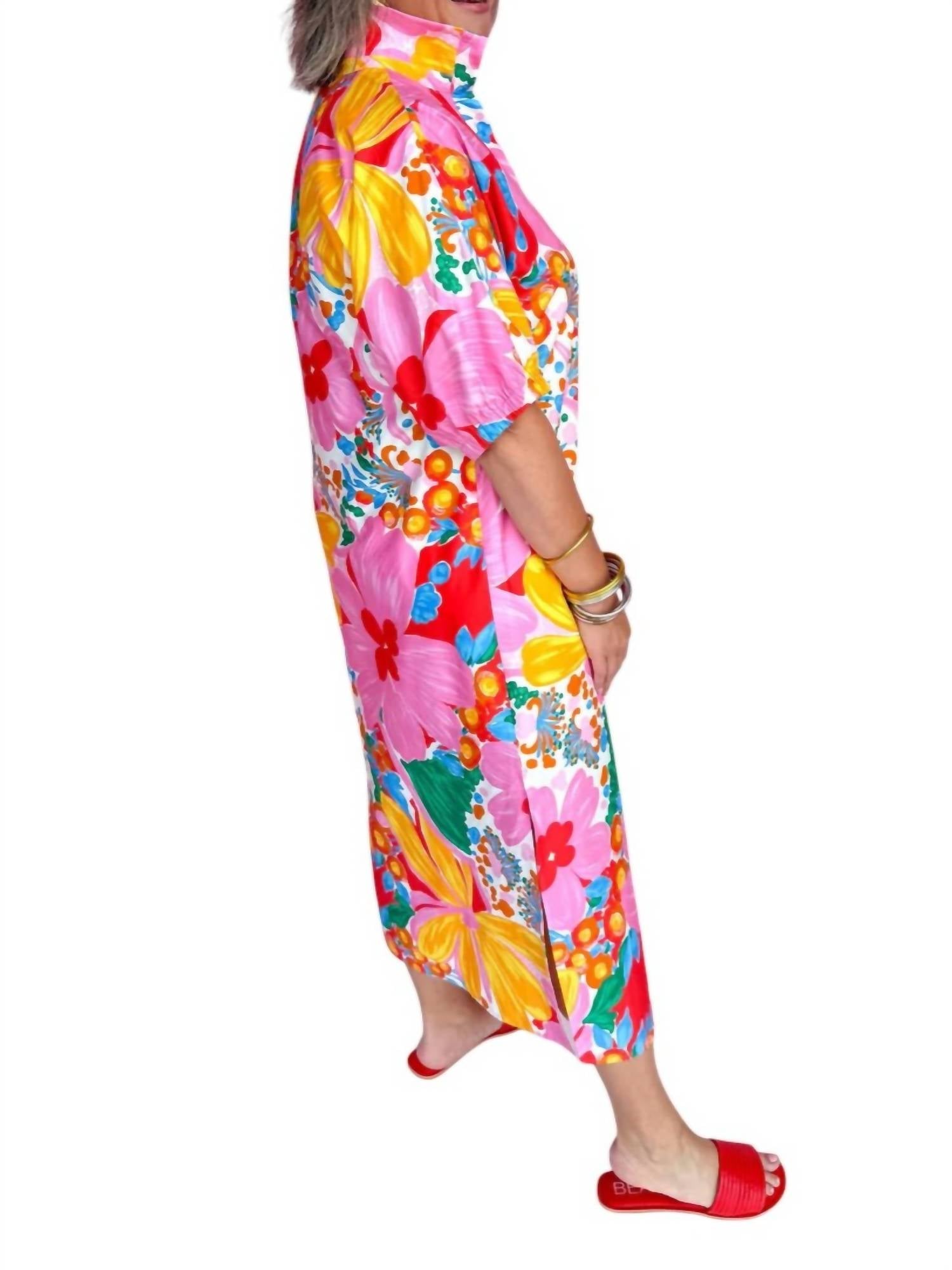 Introducing the Blakely Dress by ADRIENNE, a chic maxi dress in a vibrant Gardenscape floral pattern. Featuring a relaxed fit with short sleeves, this shift silhouette is crafted from a cotton blend composed of 97% cotton and 3% spandex. Designed with a stand-up collar and practical side pockets for added convenience, it offers side slits for ease of movement. 49.5" length for size small. Machine wash.