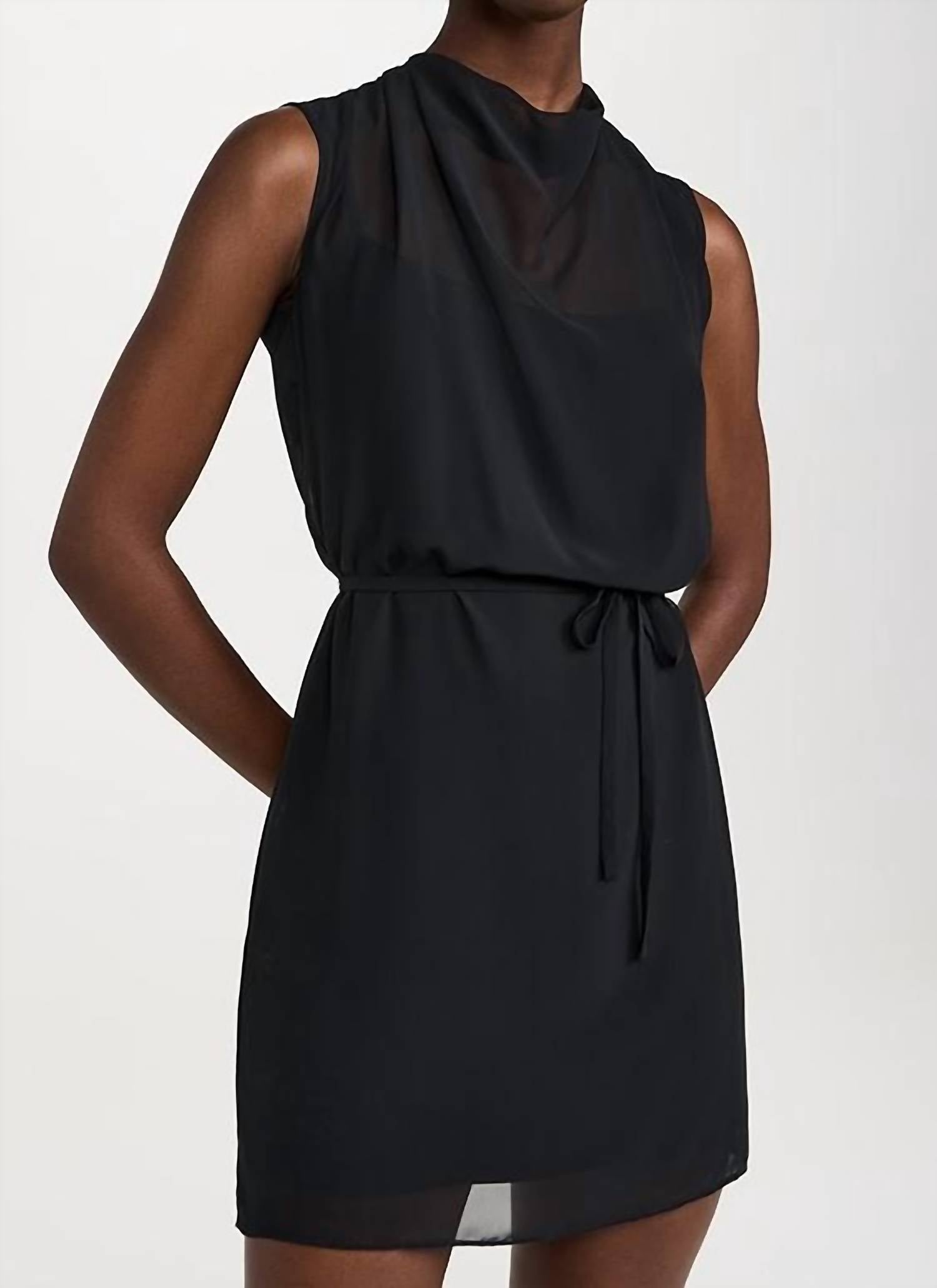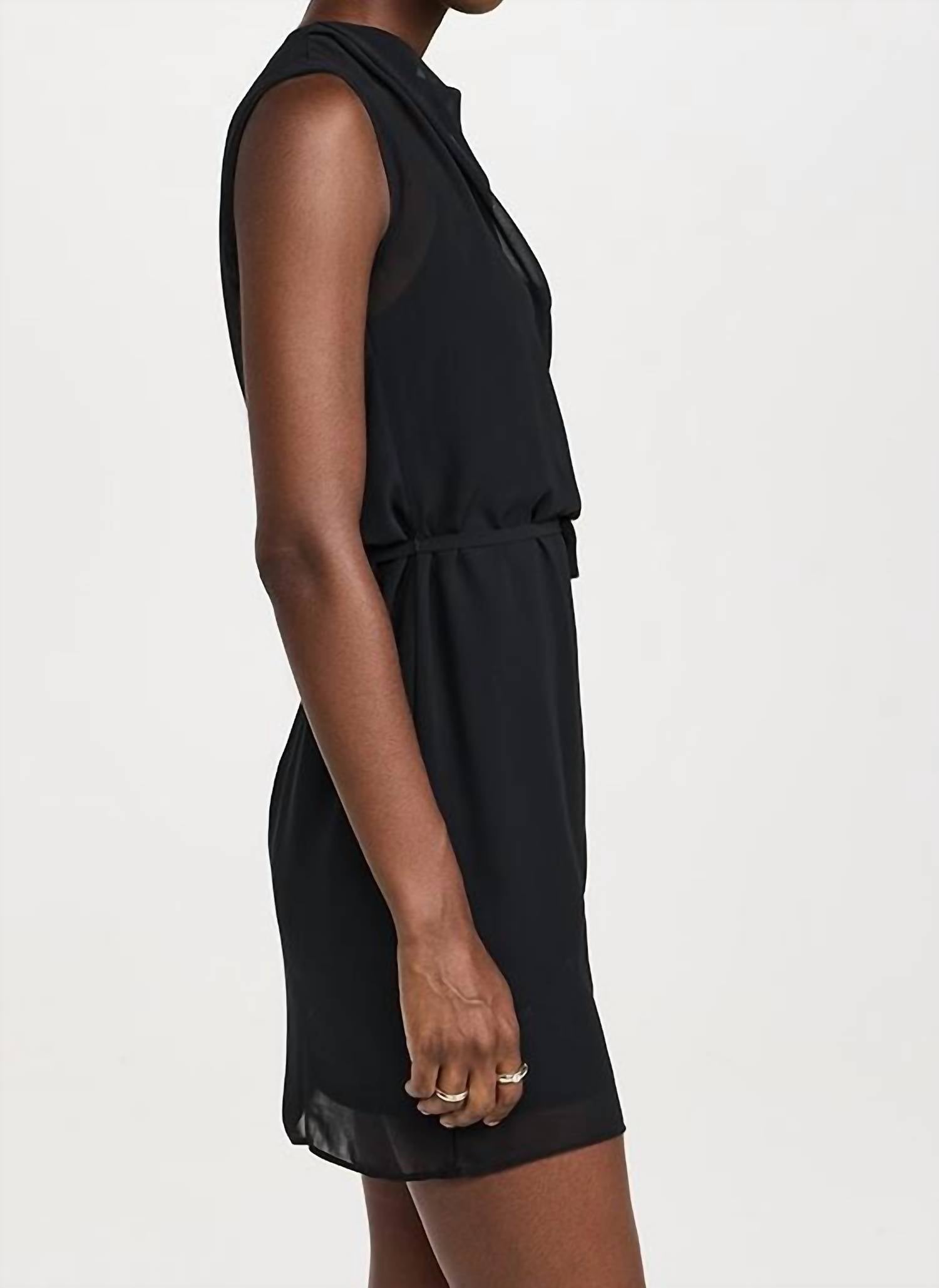 A short and breezy dress for those warmer days. Introducing the Melby Dress by Amanda Uprichard, a sophisticated piece perfect for making a statement. This sleeveless mini dress in black features a chic high cowl neck and a self-belt at the waist for a defined silhouette. Made from 100% polyester and lined with a soft Milano slip, it offers comfort and elegance with every wear. Closure: Hook and eye. Care: Dry clean only.