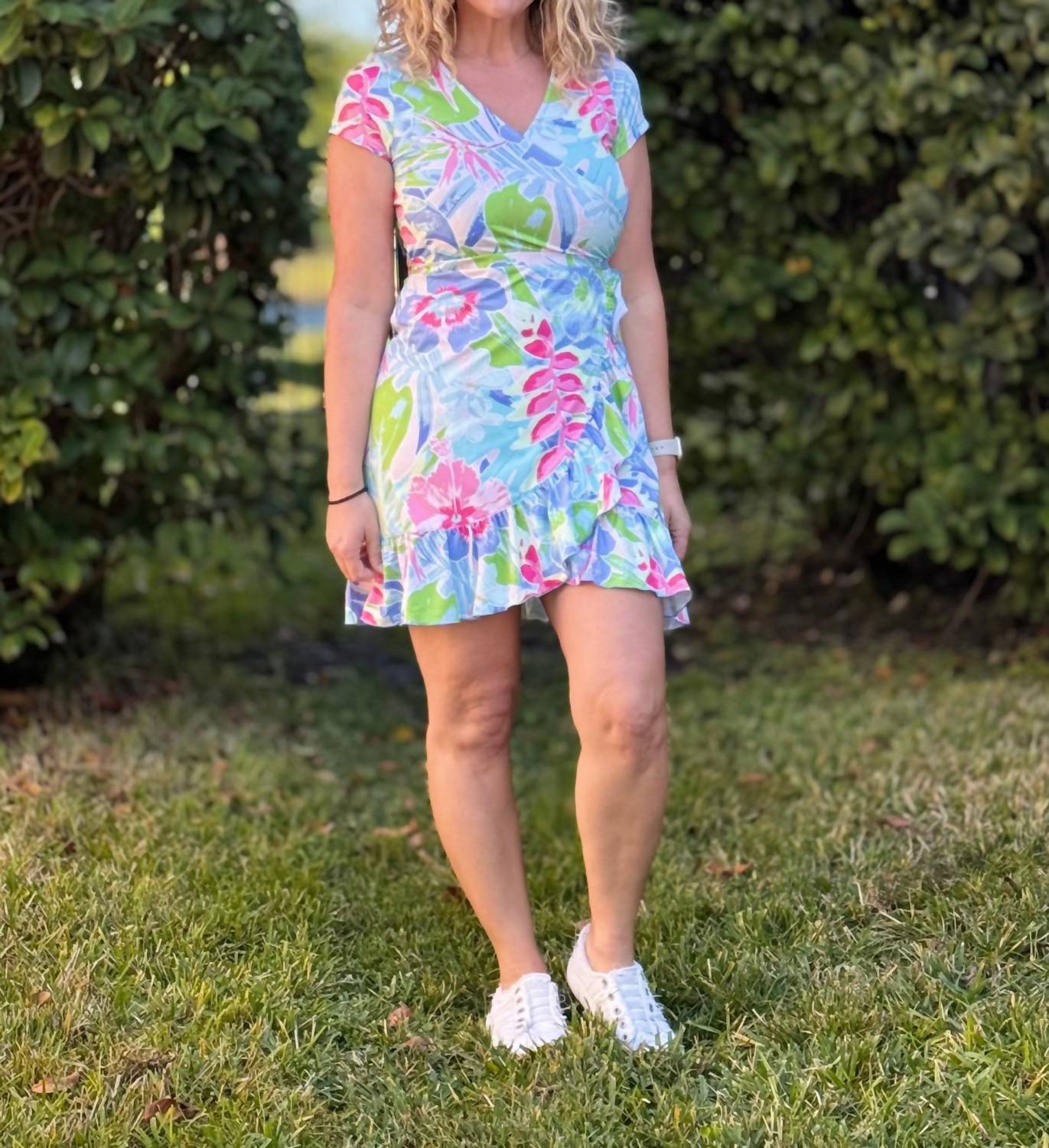 A short and breezy dress for those warmer days. Introducing the Lola Faux Wrap Dress by Ana Clare, a boho-chic floral piece in Caprese designed for summer elegance. This short-sleeve dress features a mid-length shift silhouette with a flattering wrap front and a ruffled hem, and comes with UPF 50 protection. Composition: 85% Polyester, 15% Spandex. Closure: Pull on. Care: Machine wash, line dry.