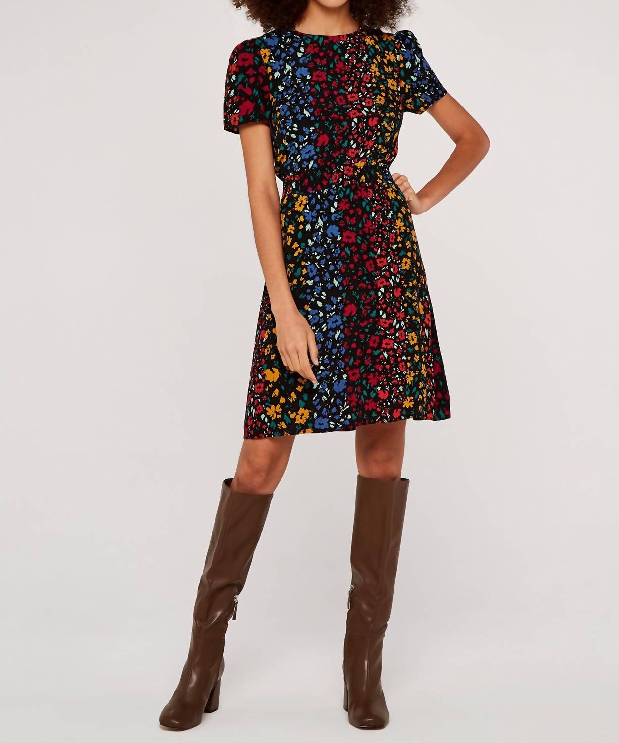 Embrace timeless elegance with the Floral Mini Dress by APRICOT, featuring a vibrant multi-colored floral pattern on a classic black base. This piece offers short sleeves and knee-length A-line silhouette combined with a fitted shape for a regular fit, perfect for any occasion. Made entirely from 100% viscose, the dress features a convenient button closure and a crewneck, ensuring both style and comfort. Care is simple, as it can be machine washed at 30°C without tumble drying or bleaching.