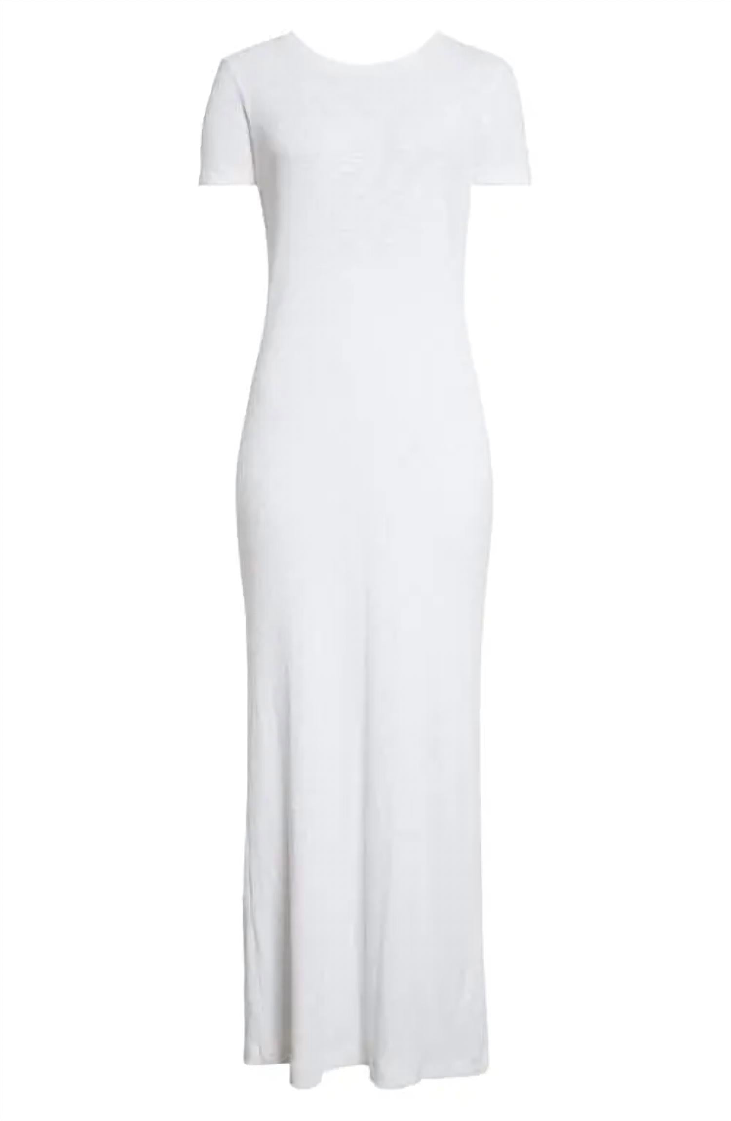 Introducing the ATM Rib Short Sleeve Maxi Dress, a stunning addition for spring evening events. This solid white dress features short sleeves and a slit in the back for a touch of elegance. Designed with a crewneck and a slip silhouette, it's crafted from comfortable cotton material. Closure: Pull on. Care: Hand wash.
