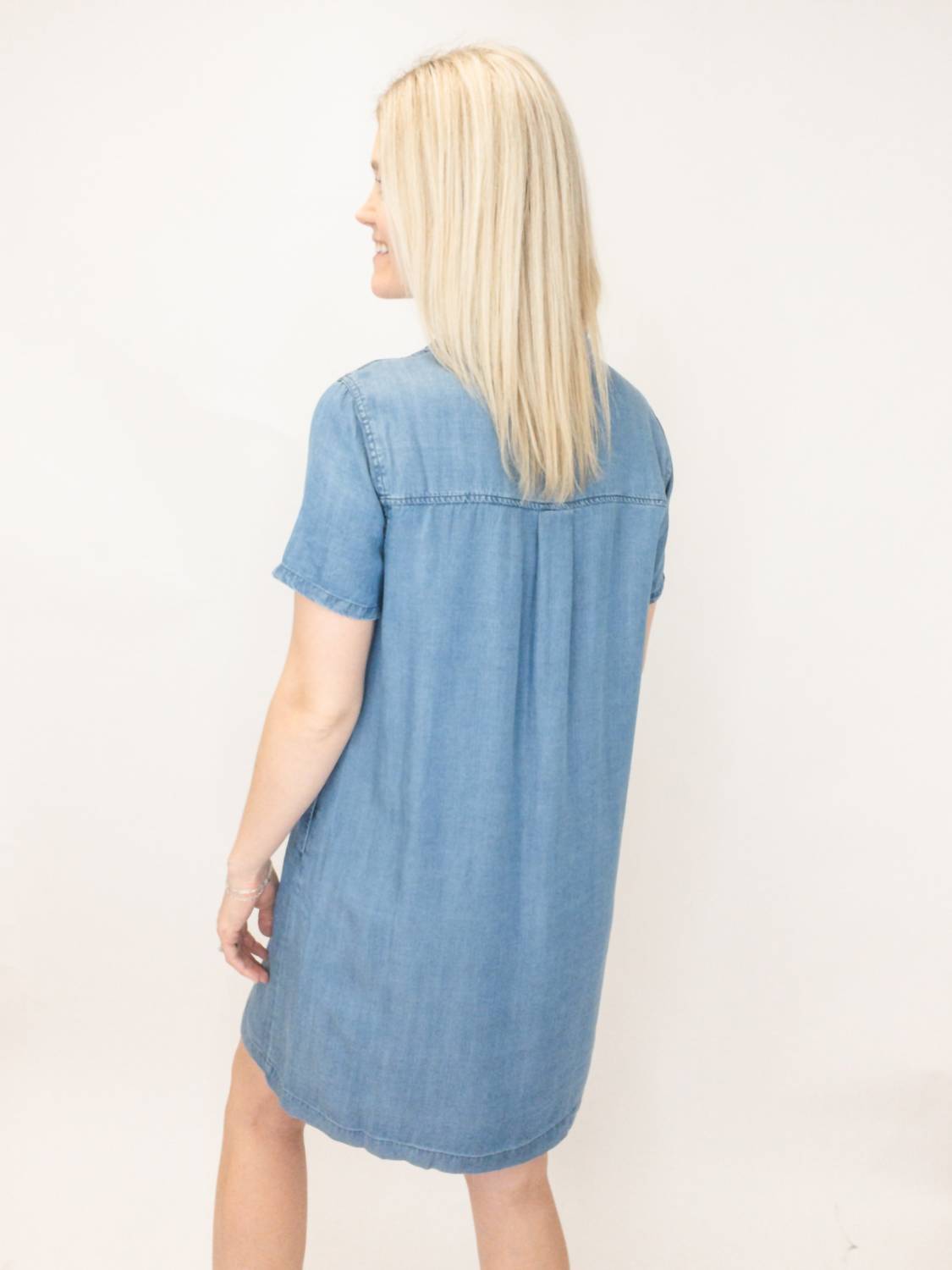 Just add slides or mules and you are good to go. Effortlessly stylish and endlessly versatile, this Tencel Mini Dress brings a modern twist to the classic denim look. Crafted from 100% Tencel, it offers a luxuriously soft feel with a lightweight drape that keeps you cool and comfortable all day long. Featuring a button-up front, chest pockets, and a relaxed collar, this minimalist silhouette is perfect for everyday wear or casual outings. Easy to care for—simply machine wash cold on a gentle cycle and tumble dry low. Iron on low heat if needed. A wardrobe staple you'll reach for again and again.