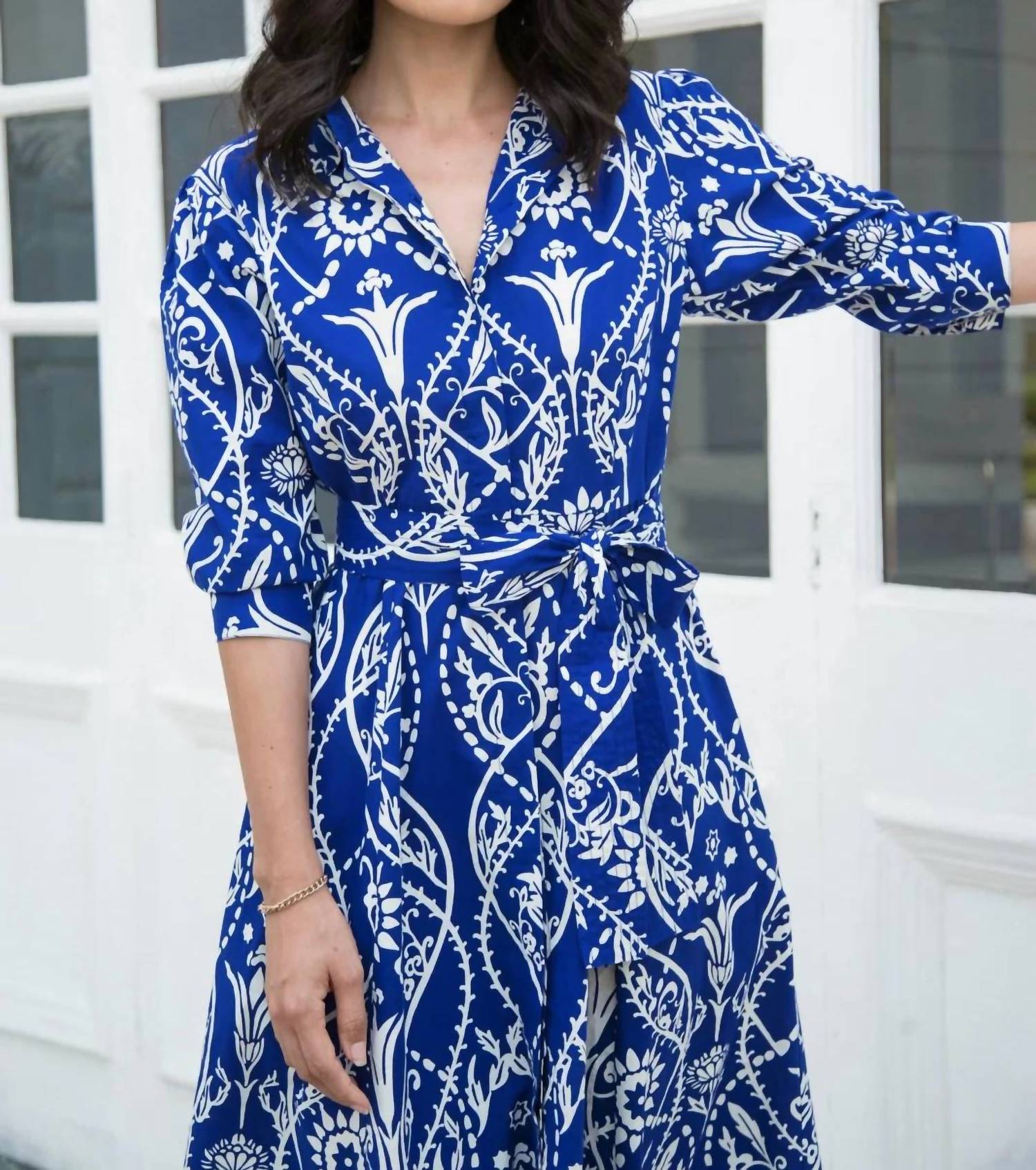 A midi dress so versatile, your options for wearing it are endless. Embrace effortless style with the Emily Shirt Dress by BEYOND by Vera, a vacation-ready piece in vibrant royal blue. Designed with three-quarter sleeves and a flattering A-line silhouette, this midi dress features a practical button-down front for easy wear. Crafted from soft, breathable cotton cambric, it promises to keep you cool even on the hottest days. Complete with pockets for added convenience, the dress is patterned to fit a maximalist trend. Care: Machine wash and tumble dry, ensuring hassle-free maintenance.
