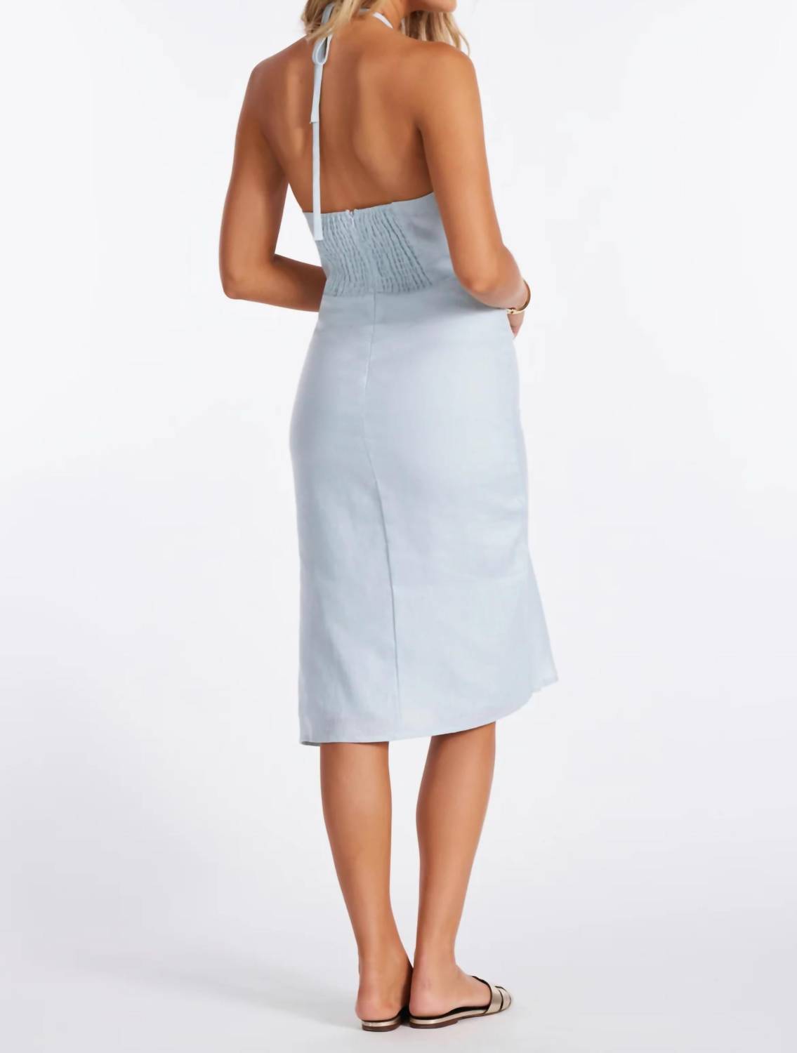 A midi dress so versatile, your options for wearing it are endless. Introducing the Positano Halter Dress by bishop + young, a stunning sheath dress perfect for any summer cocktail party. This sleeveless dress in the serene Lake color features an adjustable halter neckline and elegant side ruche detail. Made from 100% Linen, it offers a minimalist solid pattern with a chic side slit. Designed with a tie closure, for care, simply hand wash and lay flat to dry.
