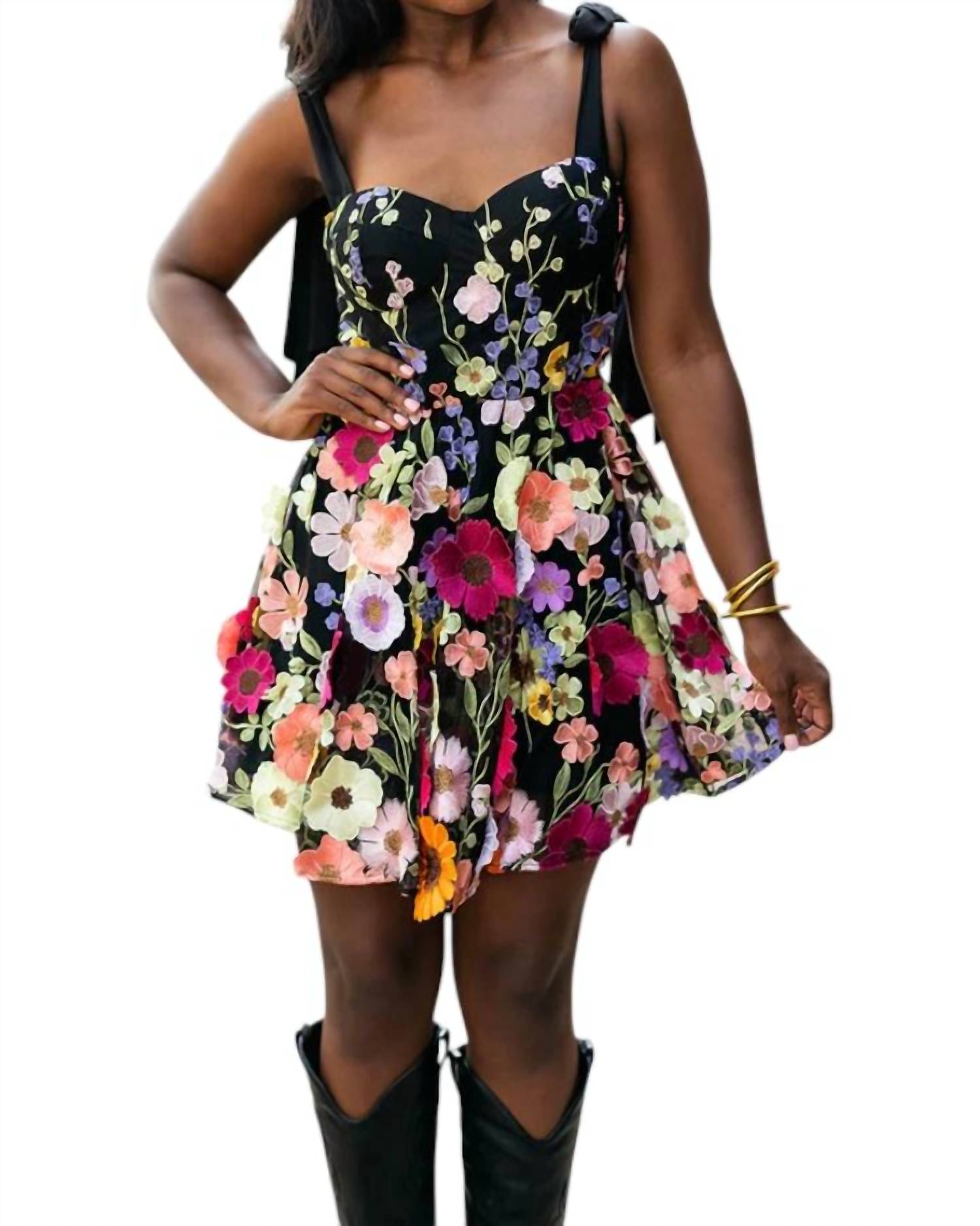 A short and breezy dress for those warmer days. Charming Harmony floral pattern. Perfect blend of comfort and style. Sleeveless mini dress. Features a flattering sweetheart neckline and a smocked back panel with floral applications. Offers a pull-on closure for easy wear. With its fitted bustier bodice and adjustable tie shoulder straps. Made from 100% polyester. Measures 24.5" from neckline to hem.