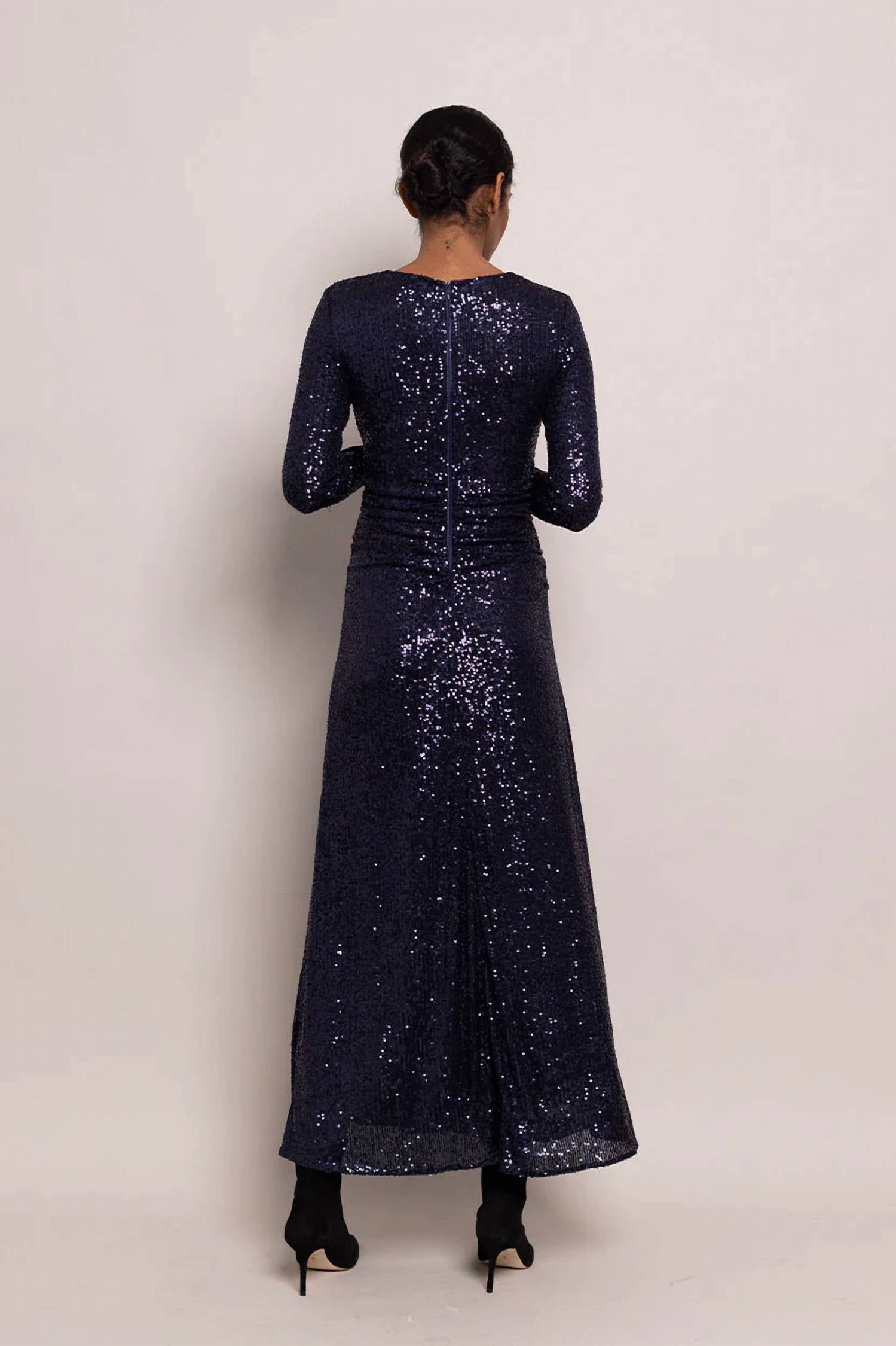 Stylish long sleeves and a flattering A-line silhouette. Crafted from 100% polyester with a poly mesh lining and sequin embellishments. Chic garment in Midnight Sequins. Ensures elegance and comfort. Invisible back zip with hook-and-eye. Dry clean only or hand wash cold. Made in China.