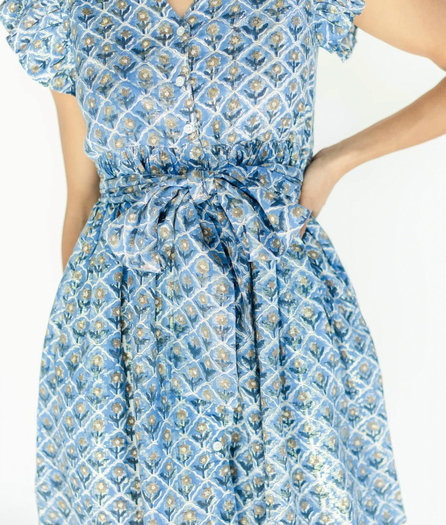 The kind of easy and flattering dress you'll be reaching for all season long. Introducing the Aeila Bell Dress by Clara the Label, a perfect transitional mini dress in stunning blue. This A-line silhouette features short flutter sleeves, a V-neckline, and a button closure from collar to hem, enhancing its versatile appeal. Crafted from 100% Cotton Lurex and lined, it is hand-blocked by artisans in Jaipur, India. Care is recommended via dry cleaning, ensuring the dress maintains its elegant charm. Model wears size XS.