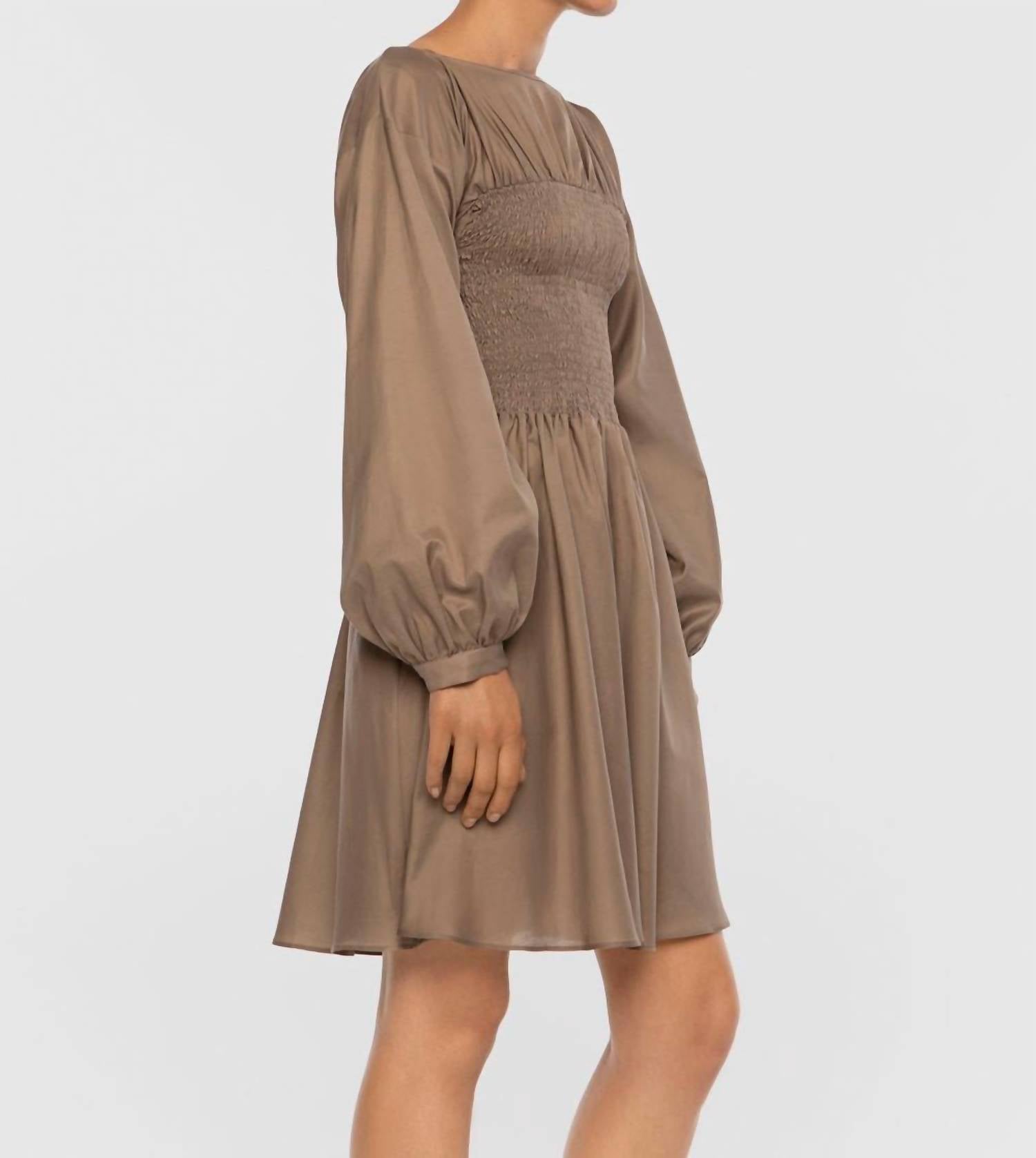 Embrace a romantic spirit with the Smocked Dress by Dāl the Label, a standout piece in a taupe hue perfect for minimalist style. This women's mini dress features long puff sleeves with buttoned cuffs and a boatneck for a refined look. Crafted from a consciously selected cotton blend, the design showcases a smocked elastic bodice that elegantly flares right above the knee. Closure: Pull on. Care: Dry clean only.