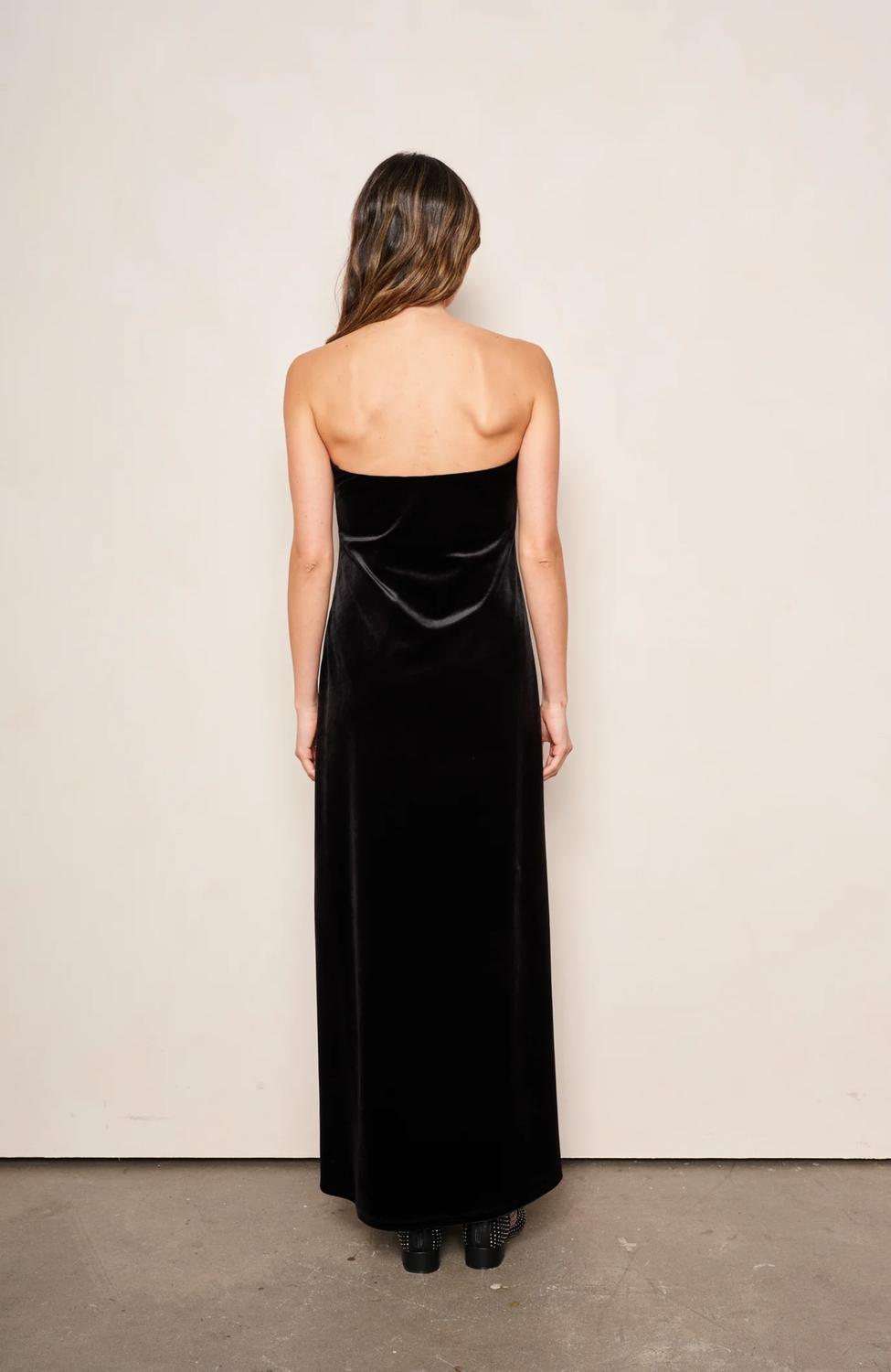 The pefect strapless dress for those warmer months. Add a cardigan for those cooler summer nights. The Adeline Dress by dRA Los Angeles, a timeless piece in solid black velvet, is perfect for achieving a look of casual refinement and effortless elegance. This strapless, off-the-shoulder maxi dress seamlessly transitions from day to night, offering versatility for any occasion. Designed as a sheath silhouette, it can be styled with heels for formal events or sneakers for a relaxed daytime look. Please note this dress has no pockets and information about closure and care instructions is not provided.
