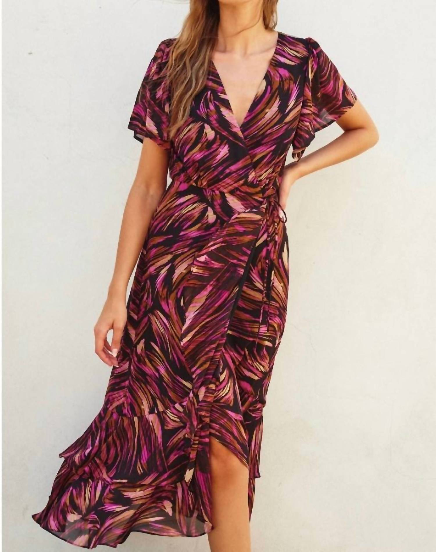 Introducing the Lights Out Wrap Midi Dress by Dress Forum, a boho chic piece in vibrant Plum Ochre. This patterned dress features short sleeves, a wrap design, and a double-layered ruffle hem for a flowy silhouette perfect for summer. Crafted from 100% polyester, it includes a loop tie fastening at the waist for a flattering fit. Care: Machine wash. Style No: FD10522-P1663.
