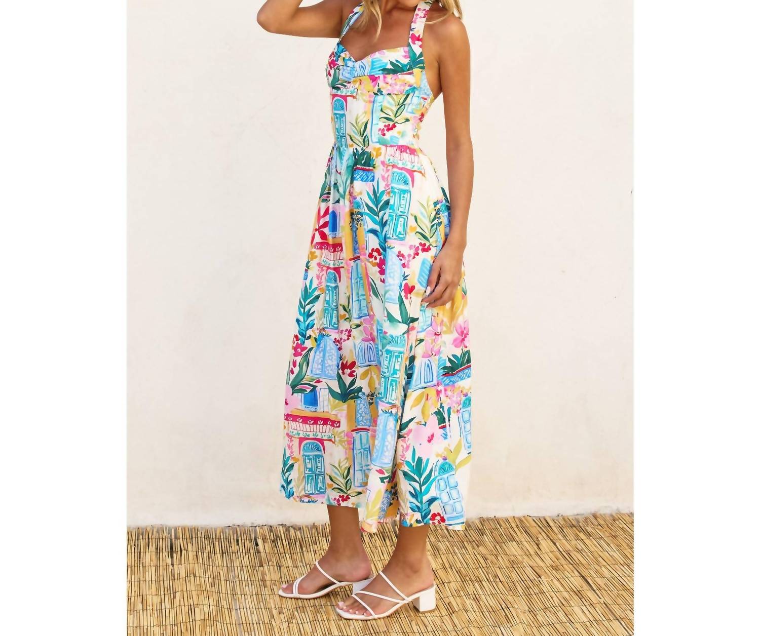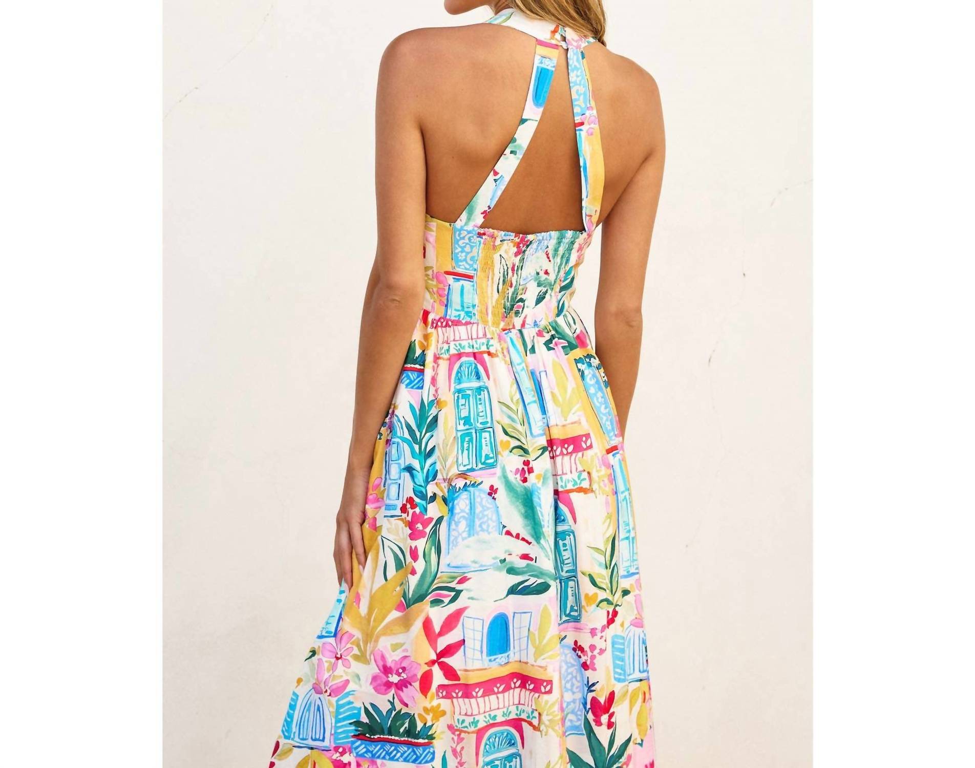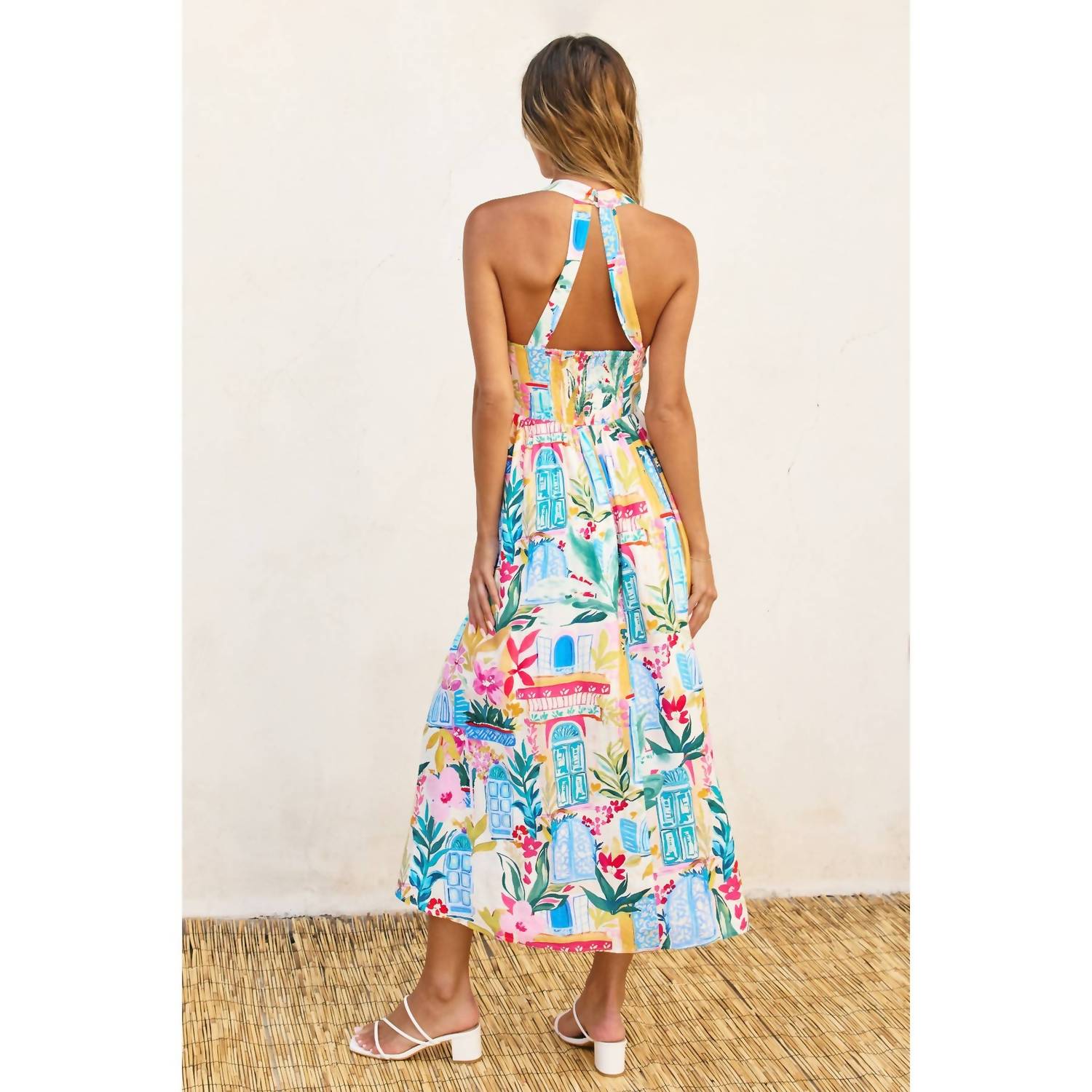 Comfortable and cute, this casual day dress has it all. The Sweet Dreams Halter Neck Midi Dress from DRESS FORUM is a chic addition to your summer wardrobe. This sleeveless, fit-and-flare dress features a captivating sweetheart neckline with pleated cup detail and a stylish open back enhanced by halter straps and a button closure. Crafted from a blend of 83% Rayon and 17% Nylon with a 100% Rayon lining, it boasts a smocked panel on the back for added comfort. The dress includes a hidden side zipper with a hook-and-eye closure, and it's machine washable, ideal for a boho chic vacation look. Model is 5'8" and wearing a size Small.