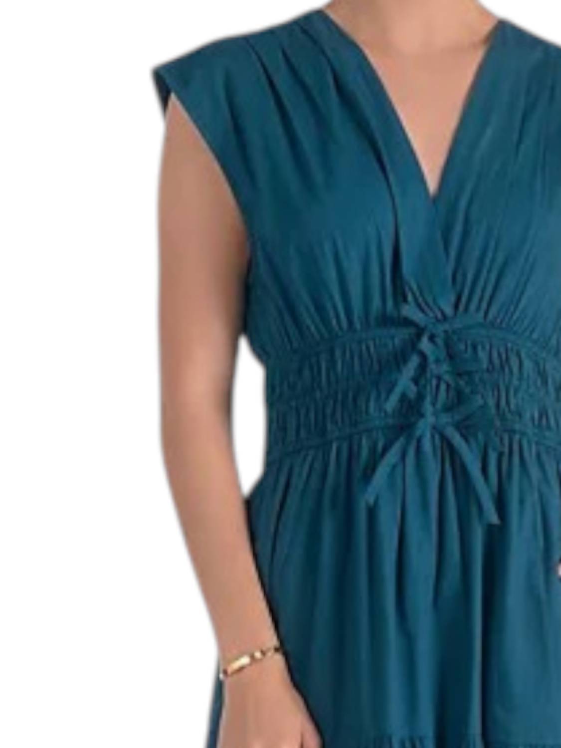 Meet the Cecily Midi Dress by ELAN in a vibrant teal, perfect for making a statement this spring. Crafted from 100% cotton, this dress features cap sleeves and an A-line silhouette with a V-neck, achieving a chic, sleek look for any event from dinner parties to festive gatherings. Made in India, this pullover style includes an elasticized waist with bow trims, side-seam pockets at the hips, and a tiered skirt that gracefully hits mid-calf. At approximately 51 inches long, this dress fits true to size with a fitted bust and waist while offering a relaxed hip fit. Care is simple with a hand wash to maintain its timeless appeal. Model is wearing a size small (5'10" height, 33.5" bust, 23.5" waist, 34.5" hips).