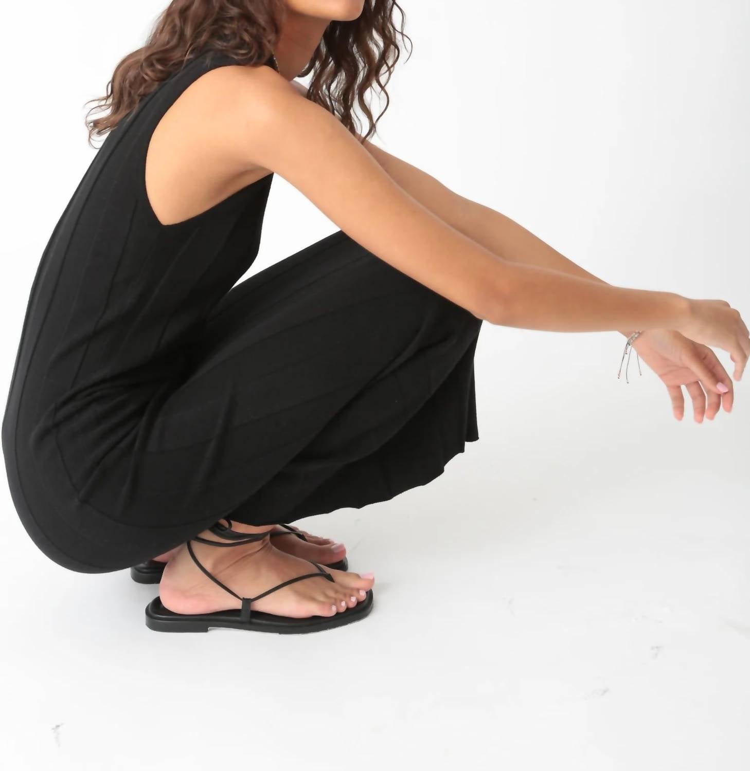 Just add slides or mules and you are good to go. Introducing the Dena Wide Rib Knit Dress by Electric & Rose in an elegant Onyx hue, perfect for versatile styling. This sleeveless dress is crafted from a luxurious blend of 70% Cotton, 20% Nylon, and 10% Silk, offering a comfortable bodycon fit that enhances your silhouette. Designed with a classic crewneck and wide sweater knit rib, and manufactured in the USA, this dress exudes timeless elegance. Closure: Pull on. Care instructions: Dry clean only. Model is 5'9" and wearing a size small.