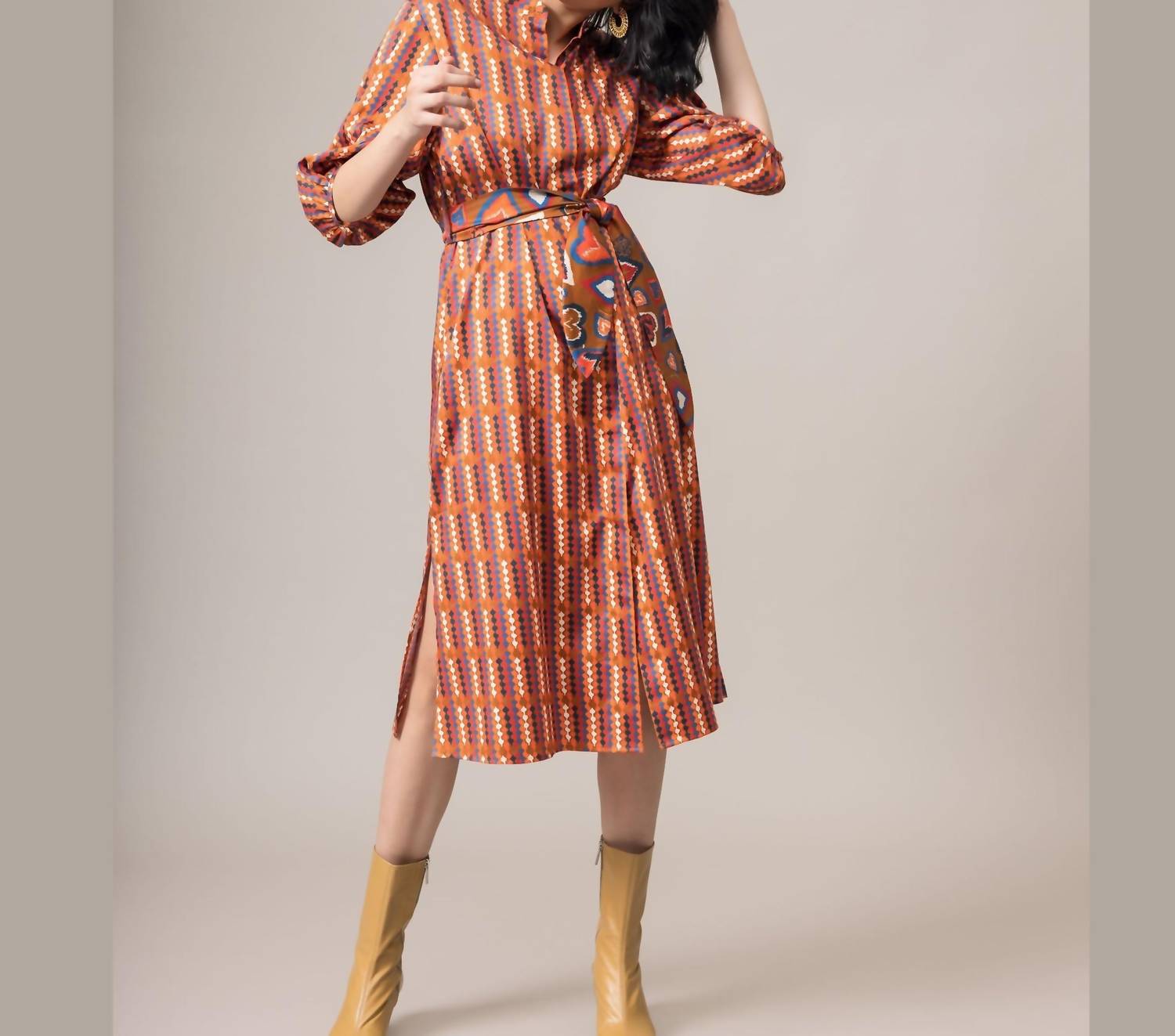 Just add slides or mules and you are good to go. Introducing the EMILY LOVELOCK Zora Dress, a captivating blend of vibrant color and graphic print designed for a standout look. This midi-length dress features three-quarter billowy sleeves, a point collar, and a button front with a covered placket, accentuated by a contrasting self-tie belt. Crafted in a style that embodies elegant refinement and casual luxury, the Zora Dress is perfect for those who appreciate playful sophistication. Closure: Button closure.