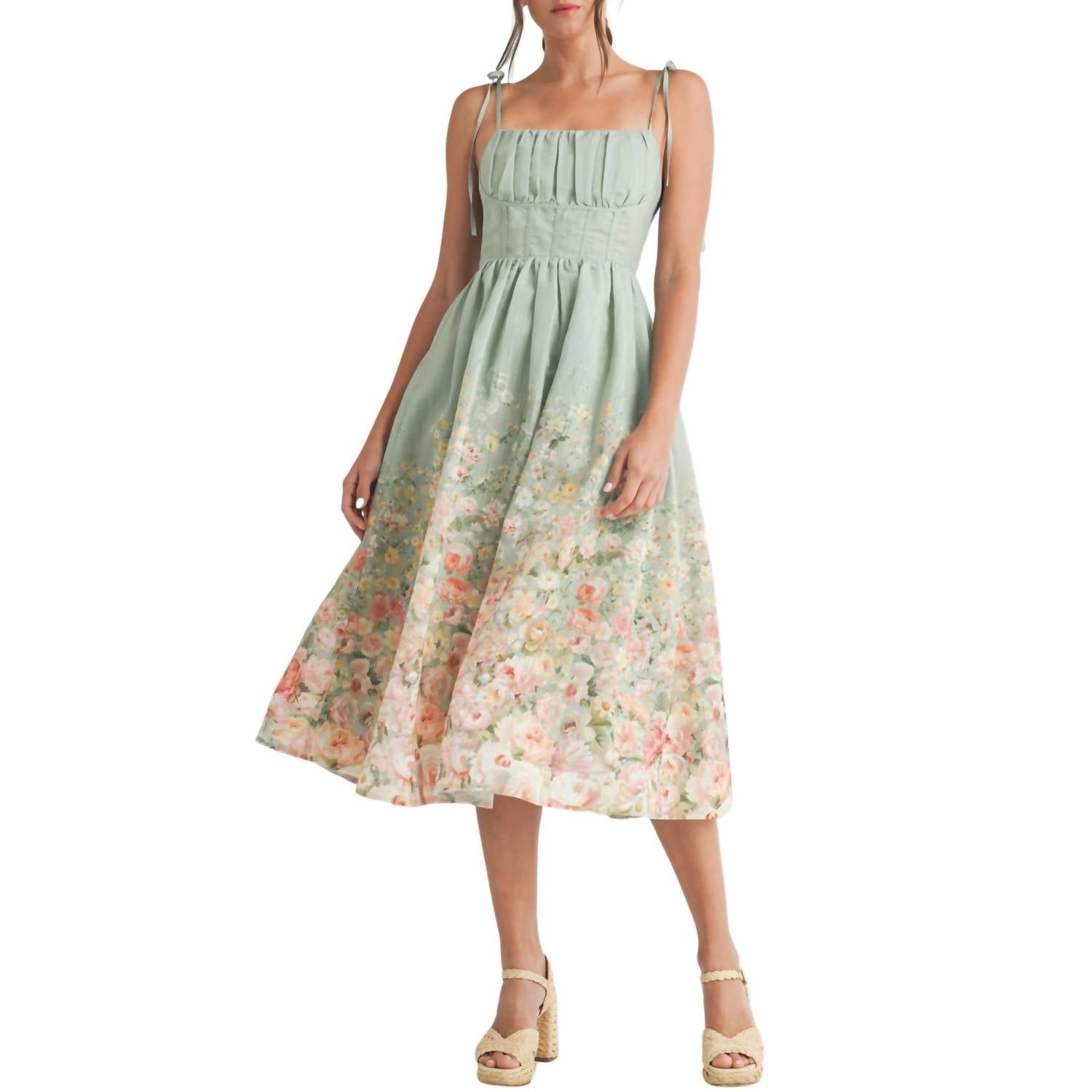 Elevate your summer wardrobe with the Floral Print Midi Dress by ENDLESS BLU, crafted in a charming vintage A-line silhouette. This sleeveless dress in a romantic sage hue showcases a pleated and smocked bodice with a vivid floral pattern. Originating from an imported collection, it features a convenient pull-on closure for easy wear. To maintain its elegance, machine wash as needed, and enjoy this piece for holiday parties and special events. 100% Polyester