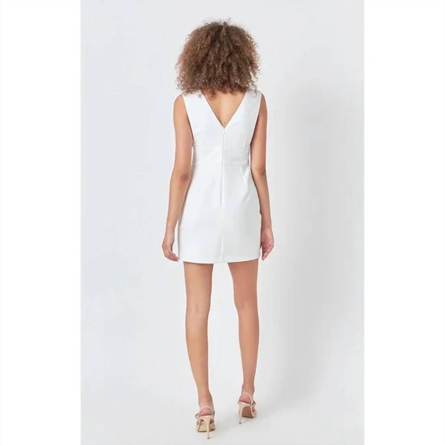 The kind of easy and flattering dress you'll be reaching for all season long. Step into a 90s-inspired look with the Cutout V-neck Mini Dress by Endless Rose, perfect for any holiday party. This sleeveless white sheath dress is crafted from 100% polyester, offering a sleek, solid silhouette ideal for spring occasions like Easter. It features a convenient zip closure for easy wear. Care instructions recommend hand washing and line drying to maintain its pristine condition.